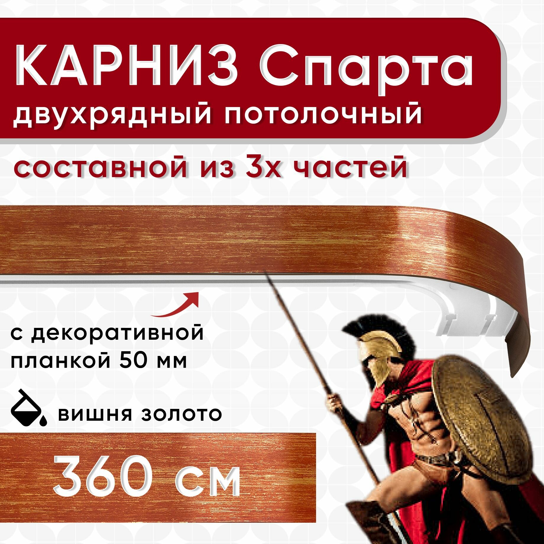 Ниже Вы можете прочитать отзывы на Карниз двухрядный с декоративной планкой Спарта, потолочный пластмассовый, вишня и золото 360 см, ознакомится с подробными характеристиками, посмотреть интересные обзоры и фотографии на Карниз двухрядный с декоративной планкой Спарта, потолочный пластмассовый, вишня и золото 360 см.