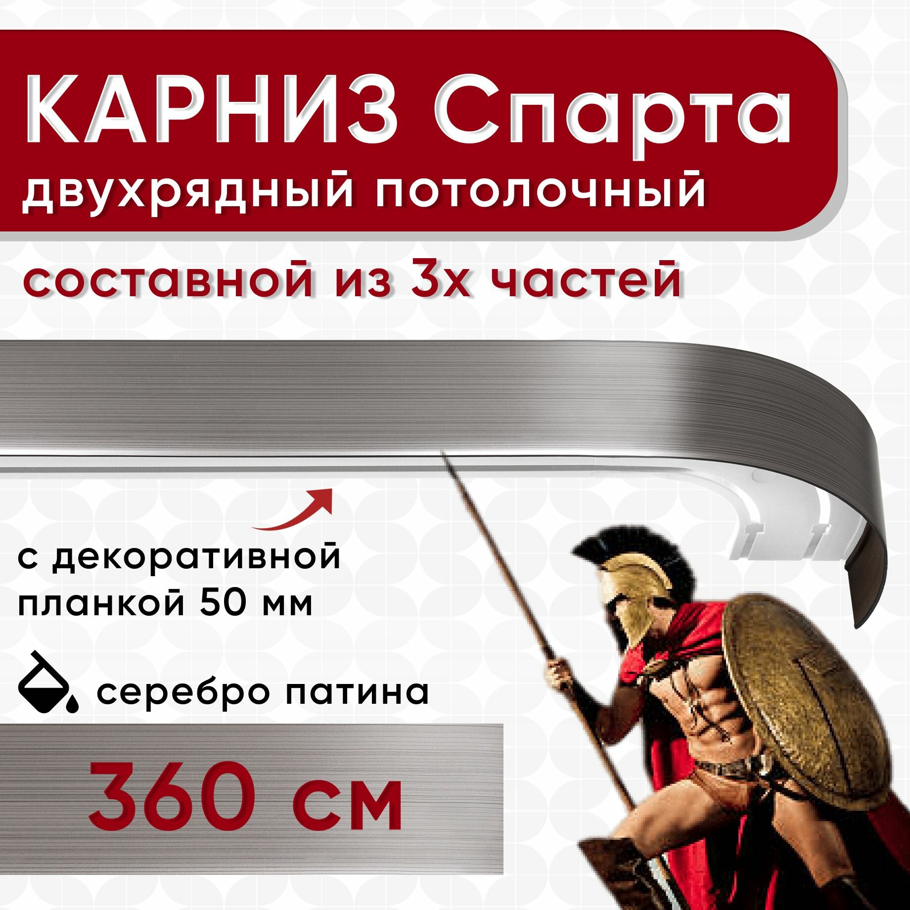 Ниже Вы можете прочитать отзывы на Карниз двухрядный с декоративной планкой Спарта, потолочный пластмассовый, серебро патина 360 см, ознакомится с подробными характеристиками, посмотреть интересные обзоры и фотографии на Карниз двухрядный с декоративной планкой Спарта, потолочный пластмассовый, серебро патина 360 см.