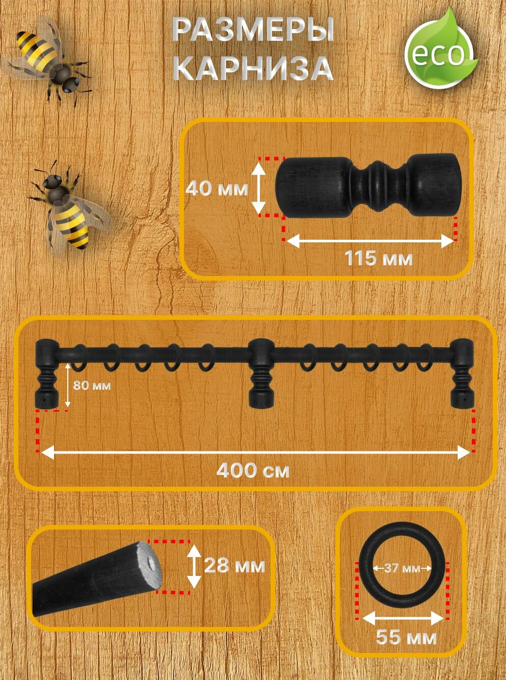 Кольца для карниза (дерево) с крючками на карниз д 28 мм-20шт