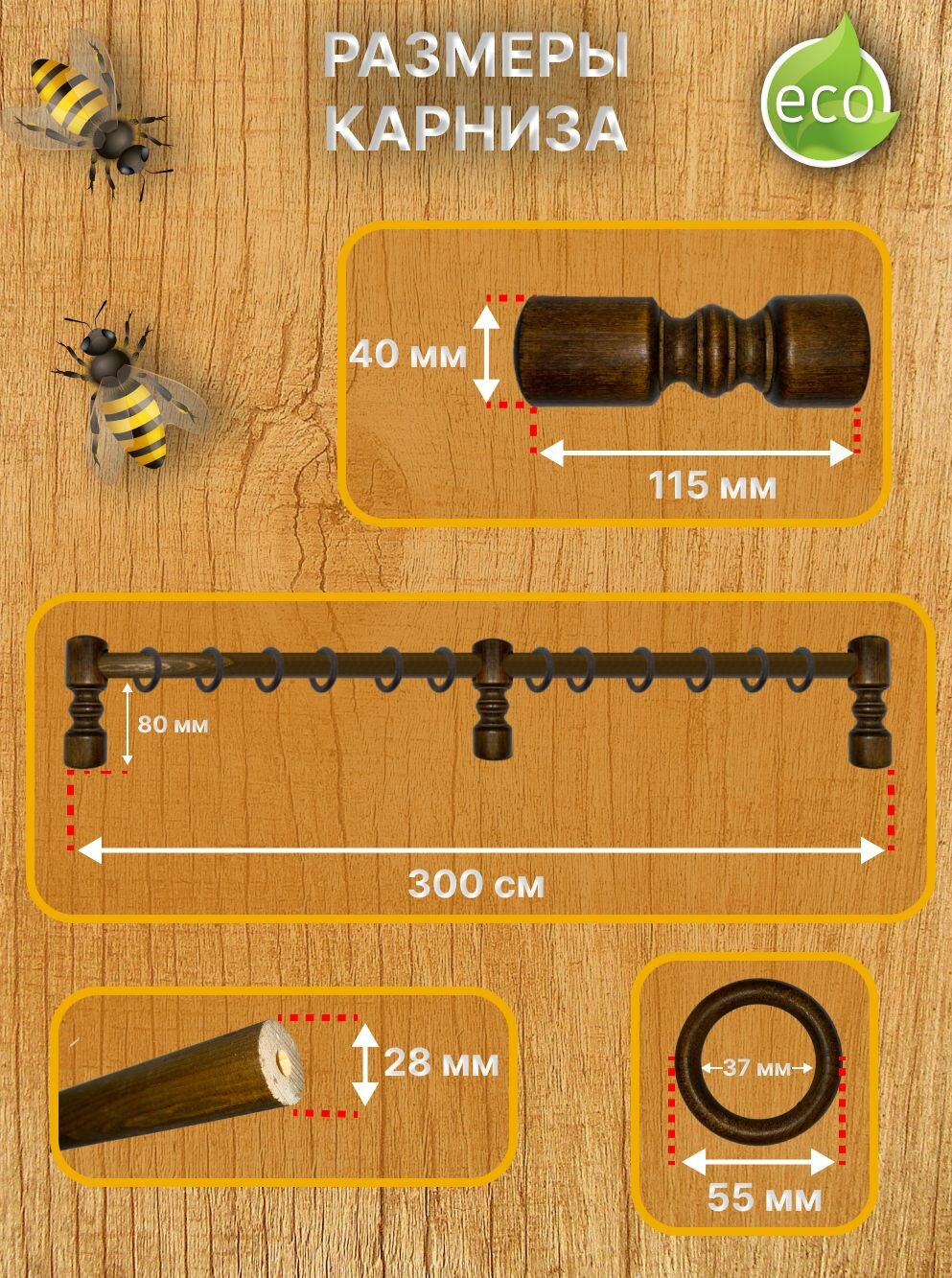 Кольца для карниза (дерево) с крючками на карниз д 28 мм-20шт