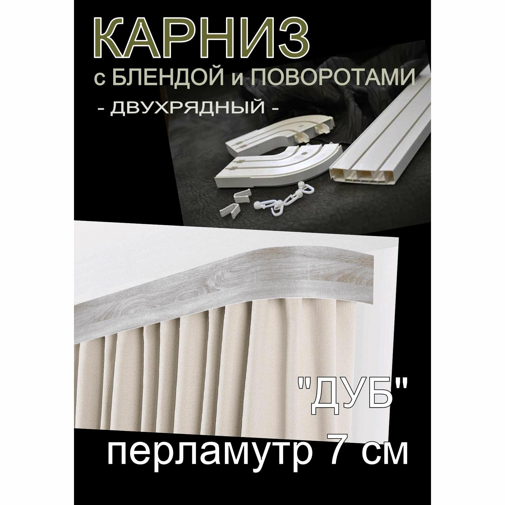 СохранитьБагетный карниз ПВХ с поворотами, 2-х рядный, 160 см, , с блендой"Дуб перламутр", 7 см интересное:
