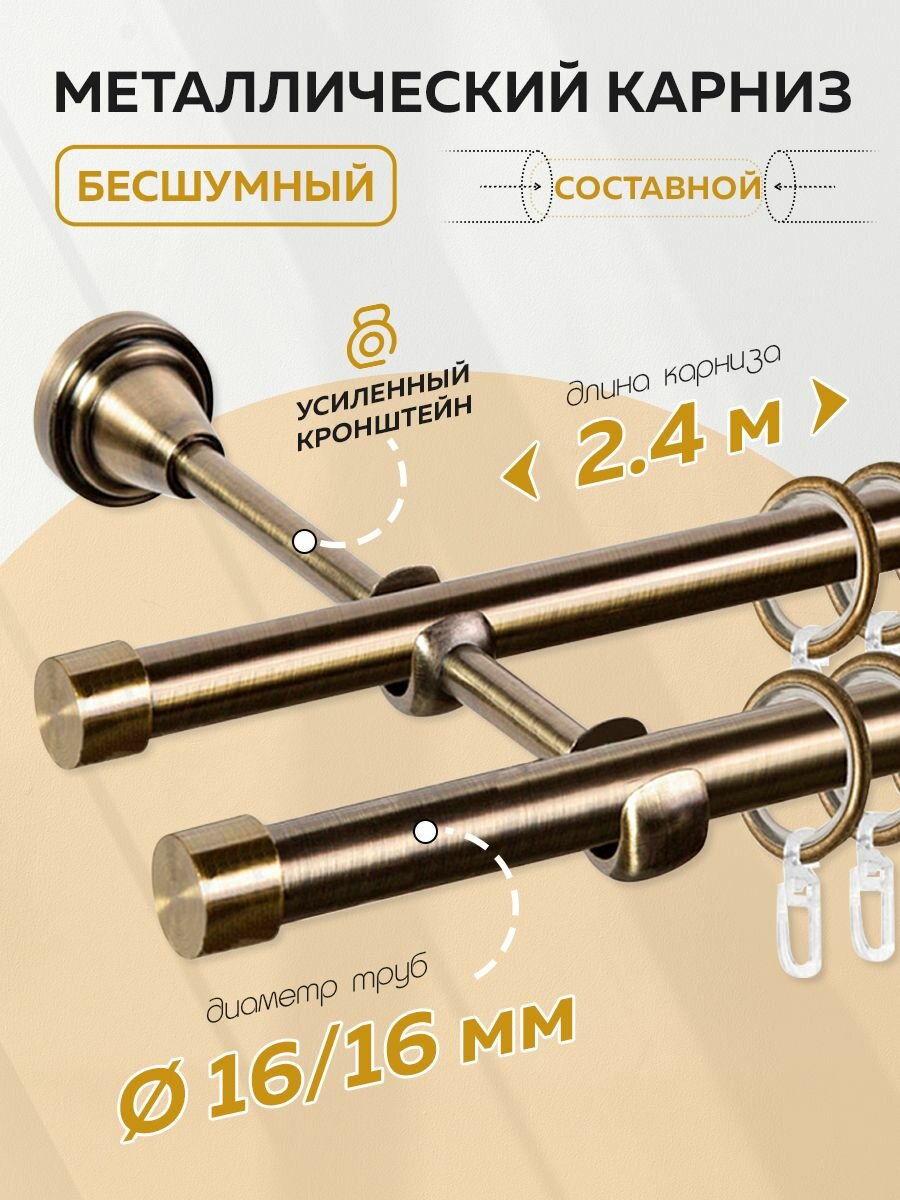 Карниз для штор двухрядный металлический гладкий Mirtex "шишка" 16/16 мм цвет Антик, длина 2,4 м