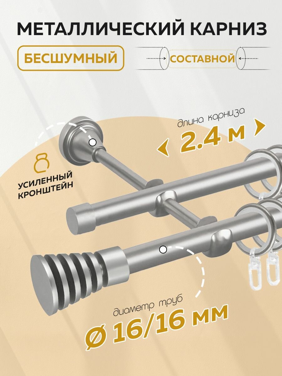 Карниз для штор двухрядный металлический гладкий Mirtex 16/16 мм, цвет Сатин, длина 2,4 м (4 заглушки)