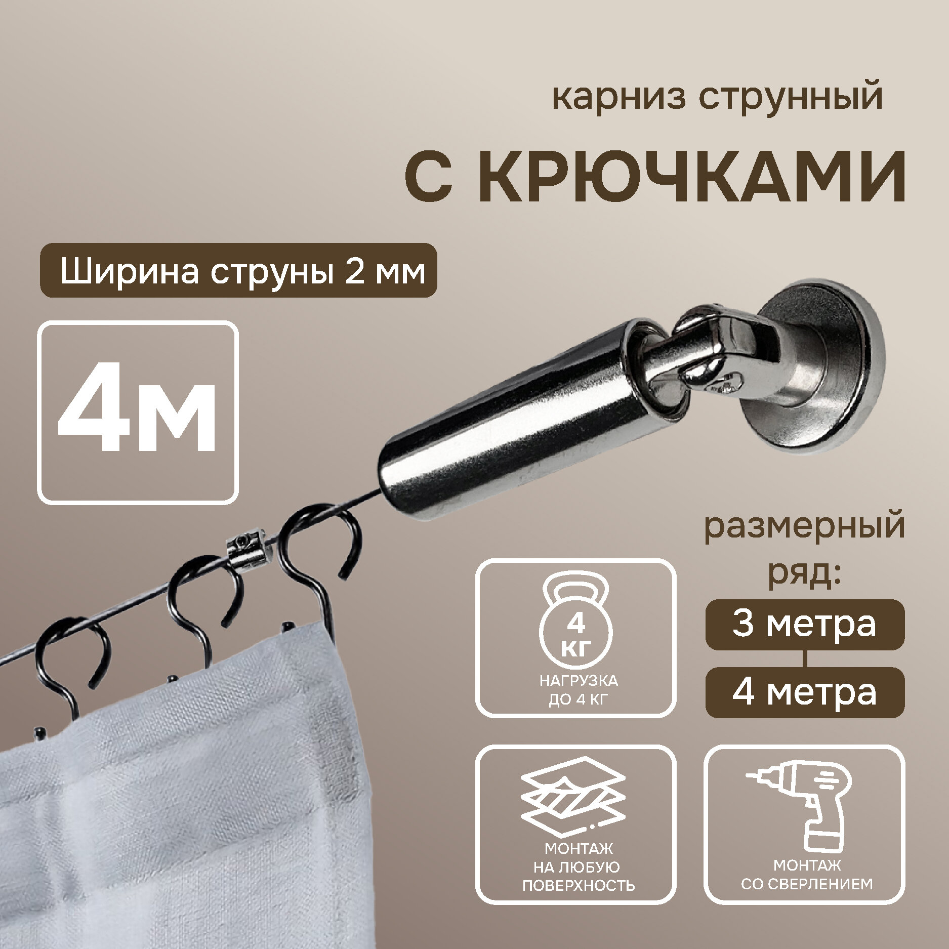 Струнный карниз для штор однорядный 4 м, "Эскар", арт.2278400, металл, серебристый интересное: