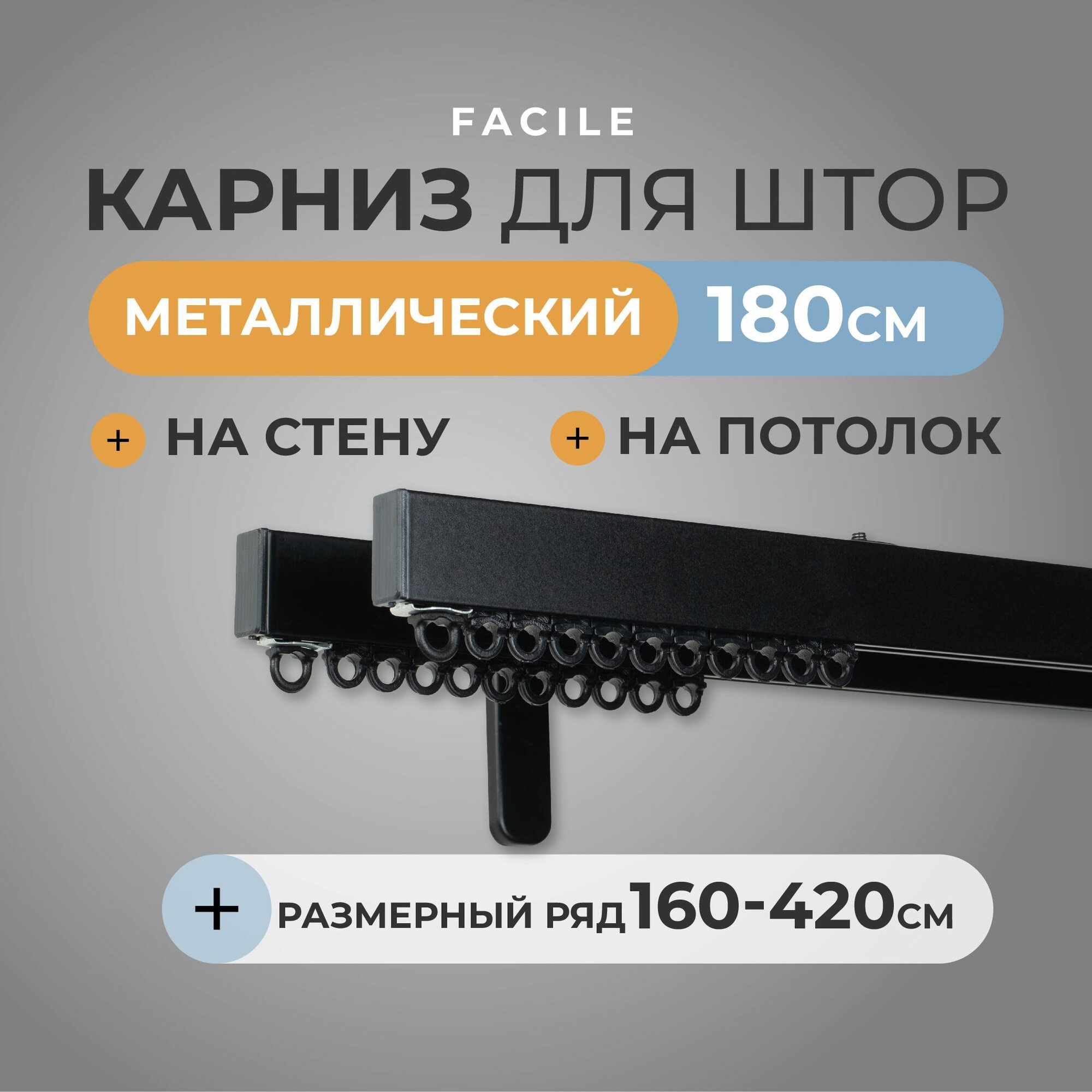 Карниз для штор из металлического профиля настенный, потолочный двухрядный алюминиевый 420 см Facile черный