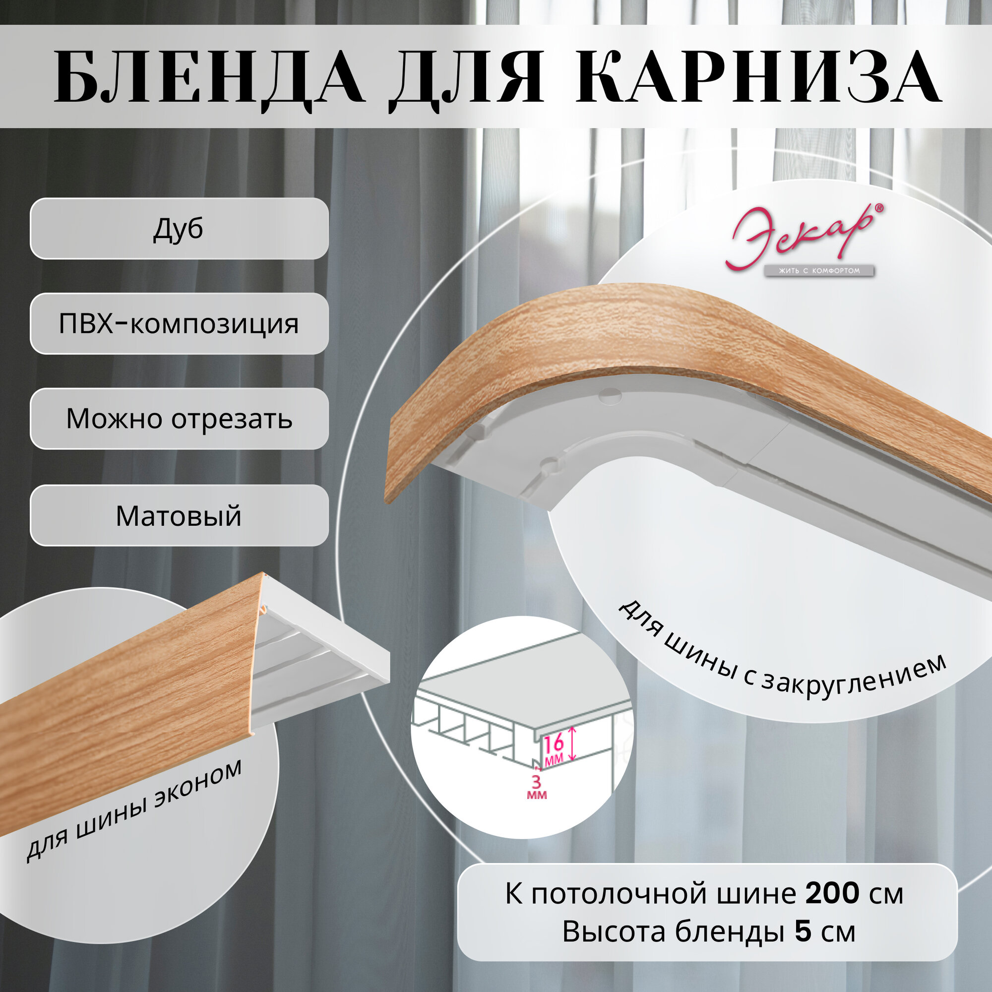 СохранитьБленда для карниза 200 см, цвет Дуб, ширина 5 см, размер замка 16 мм, пластиковая для потолочной шины интересное: