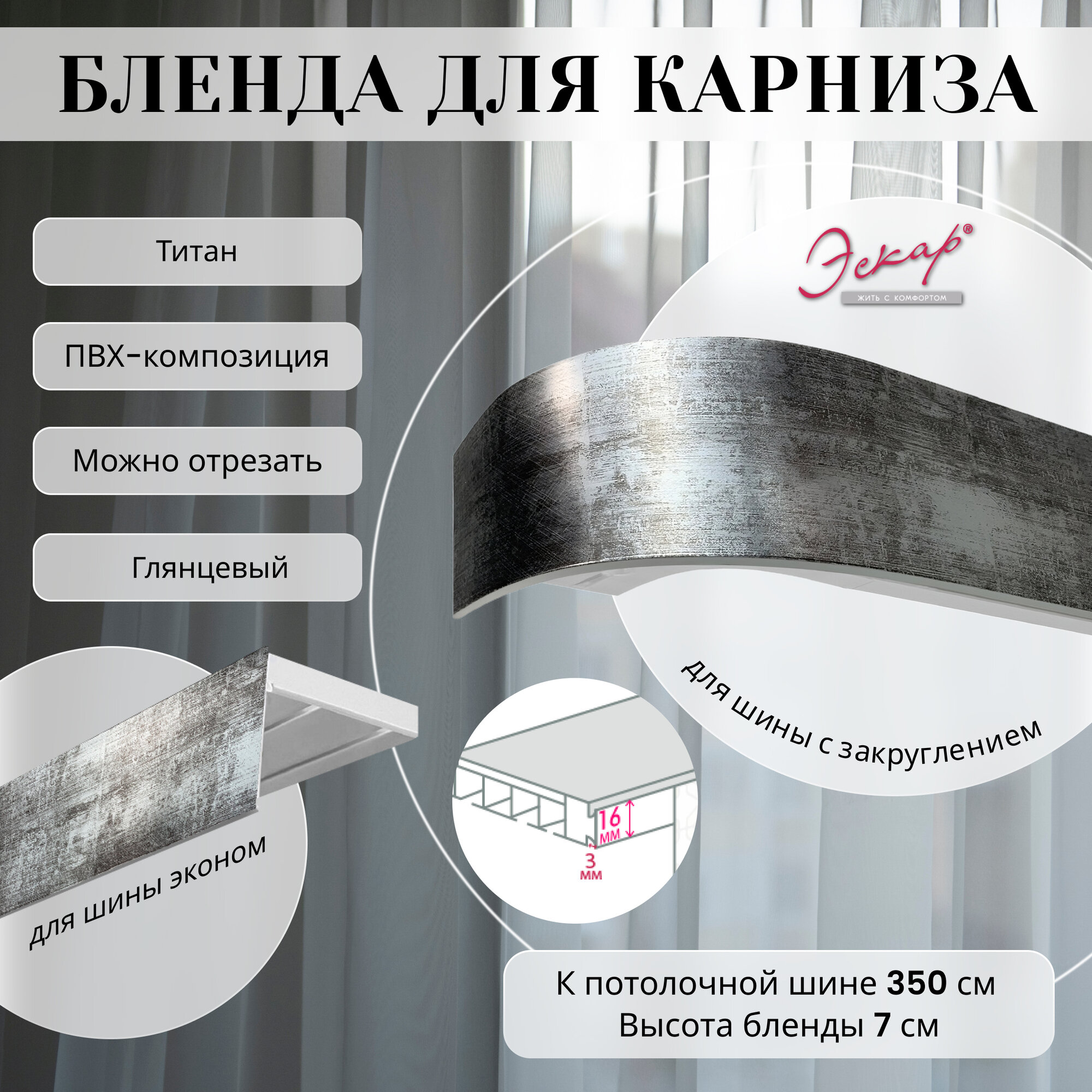 СохранитьБленда для карниза 350 см, цвет Титан, ширина 7 см, размер замка 16 мм, пластиковая для потолочной шины интересное: