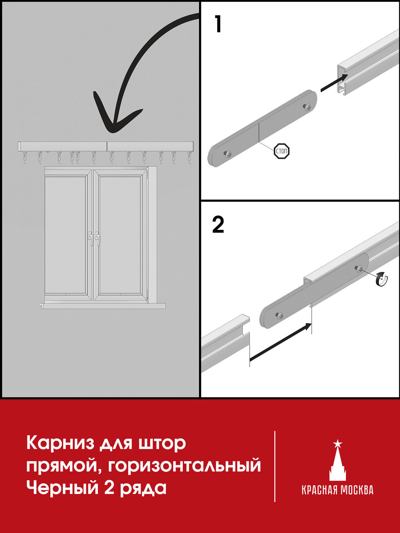 Прямой (Горизонтальный, штора сдвижная. Не подходит для наклонного положения) карниз для штор на скошенные окна, Черный 2 ряда. Для мансардных или диагональных окон, 180 см