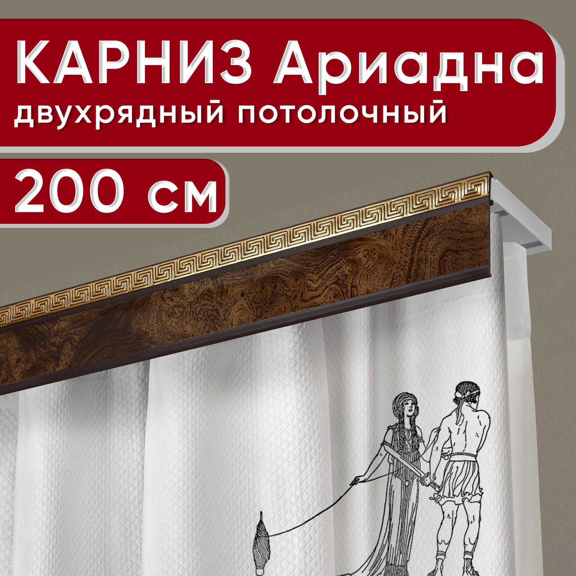 Карниз двухрядный потолочный с декоративной планкой, пластмассовый Ариадна, орех 200 см