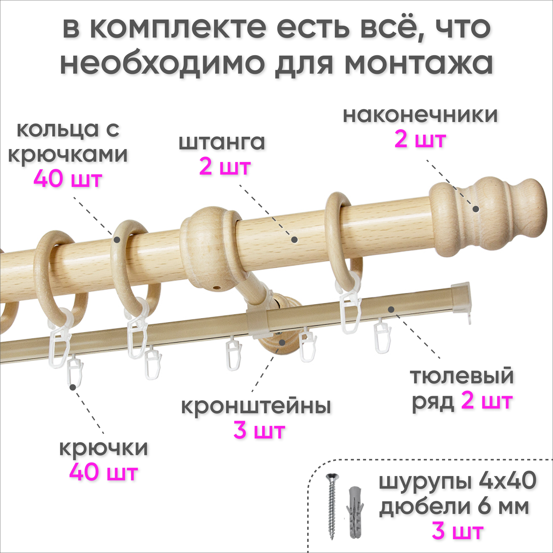 Карниз круглый деревянный настенный двухрядный D20 300 см Натуральное дерево