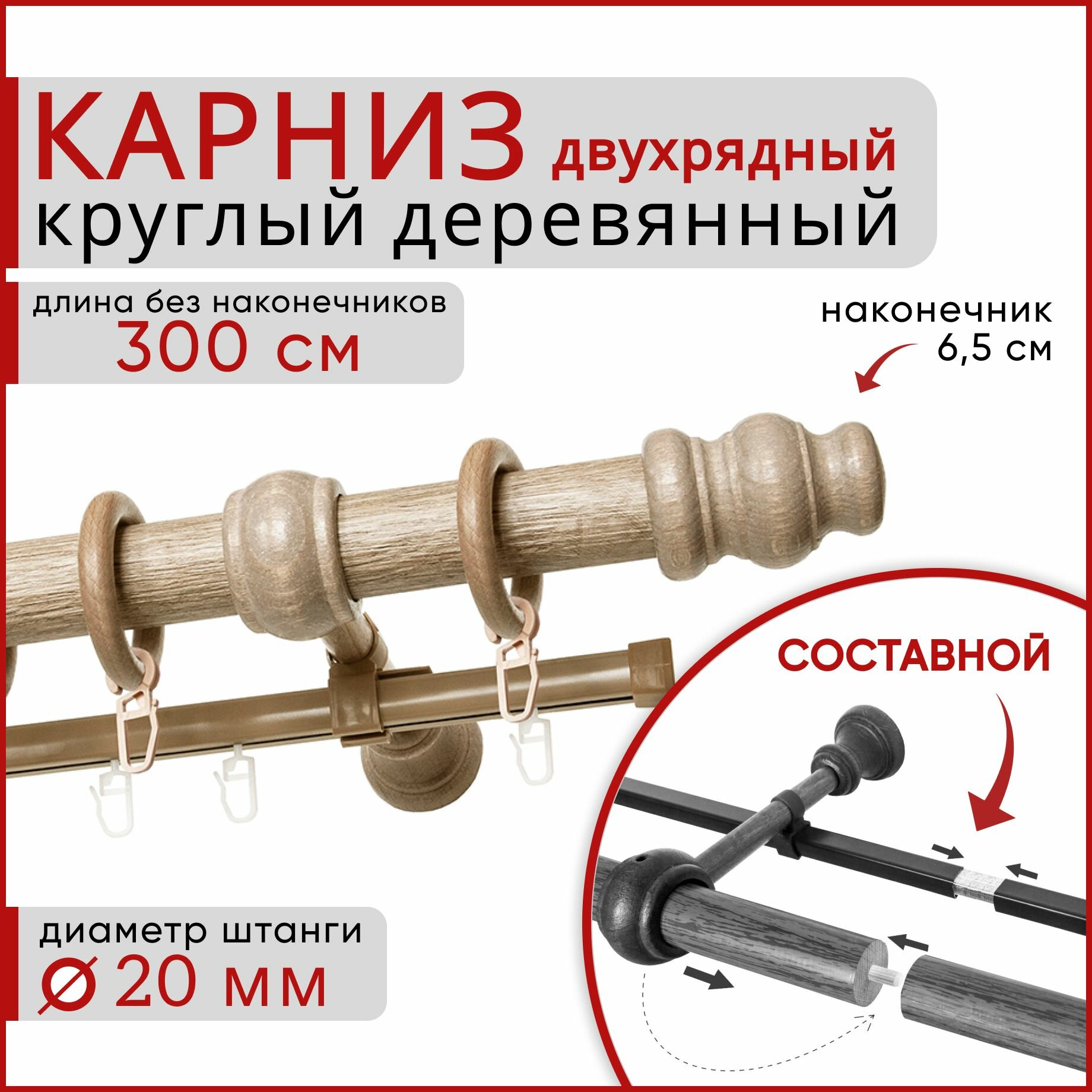 Карниз круглый деревянный настенный двухрядный D20 300 см Дуб