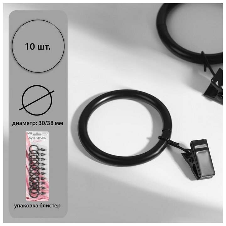 Купить Кольцо для карниза, с зажимом, d = 30/38 мм, 10 шт, в блистере, цвет чёрный