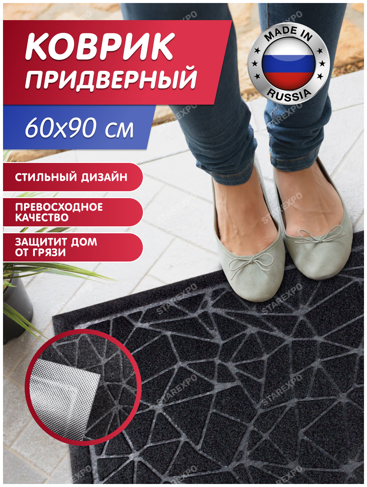 Коврик придверный грязезащитный для входной двери, размер 60х90 см, цвет черный интересное: