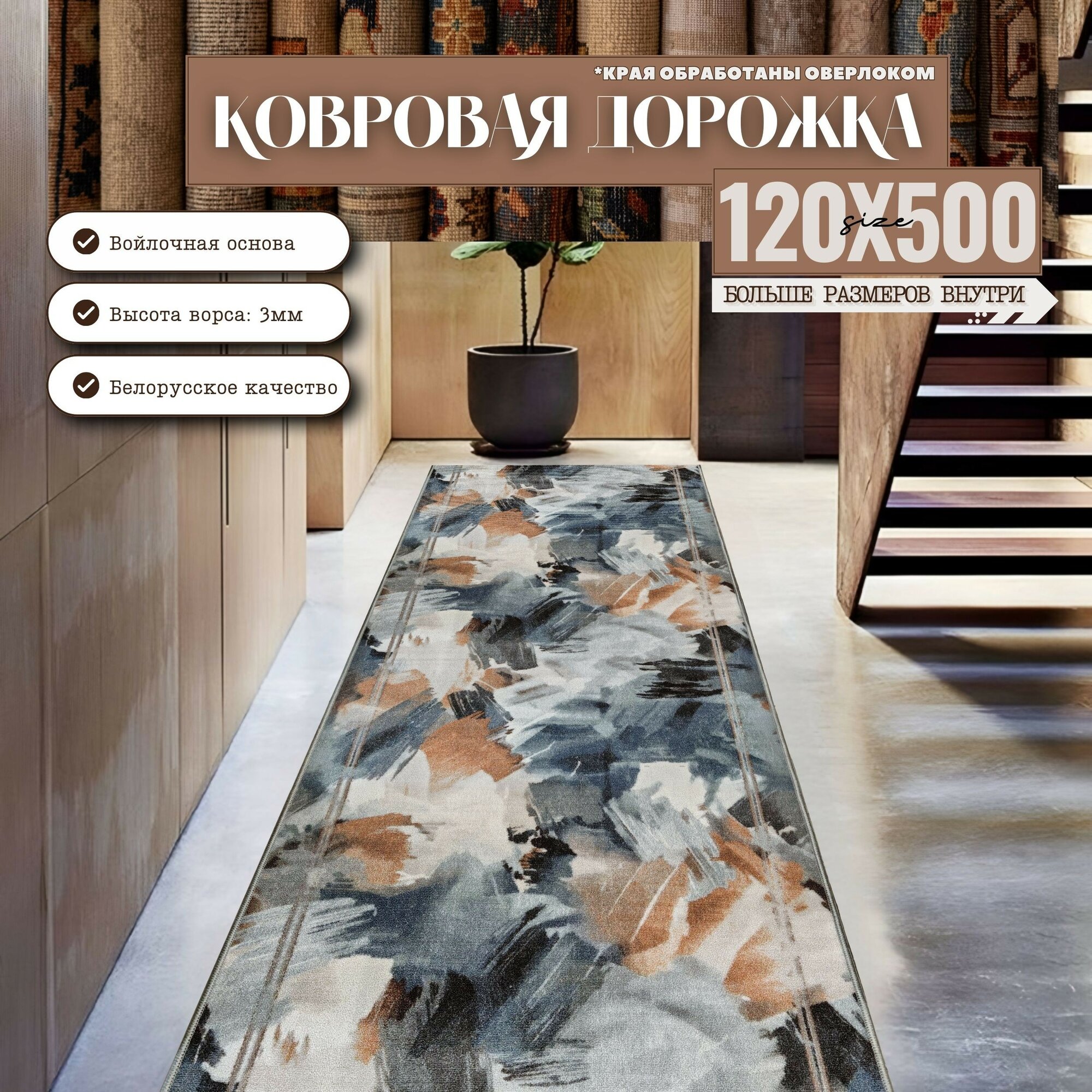 Ковровая дорожка на отрез без ворса "Акварель" 120х475 см + оверлок торцов