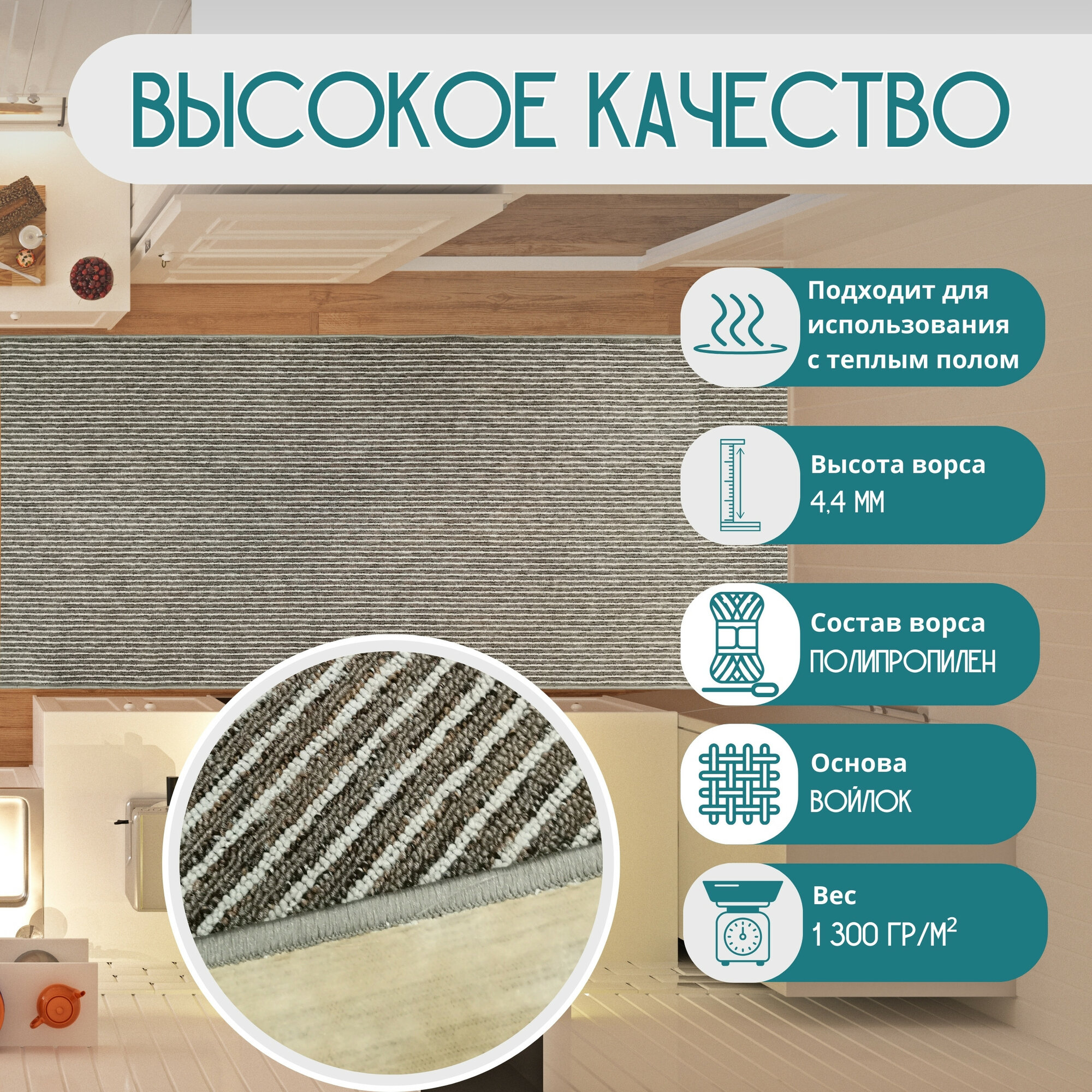 Ковровая дорожка ворсовая "STEP", коричневая 150х750 см + оверлок торцов