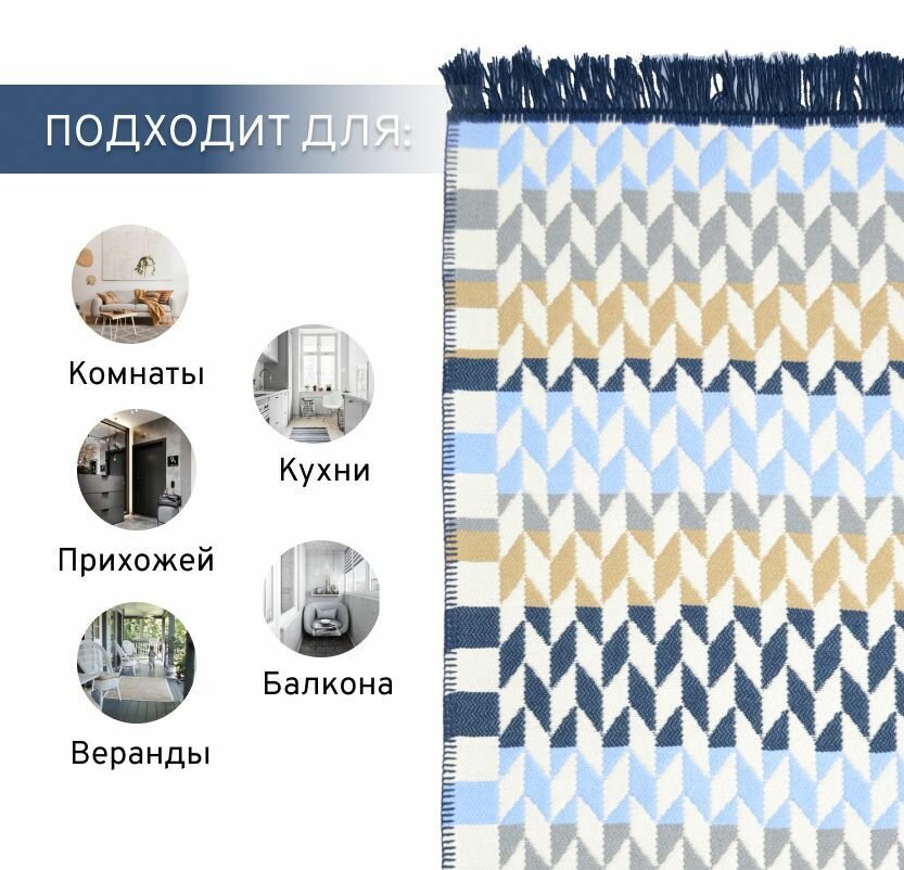 Ковер безворсовый на пол турецкий Килим, 80х150, бежевый, синий
