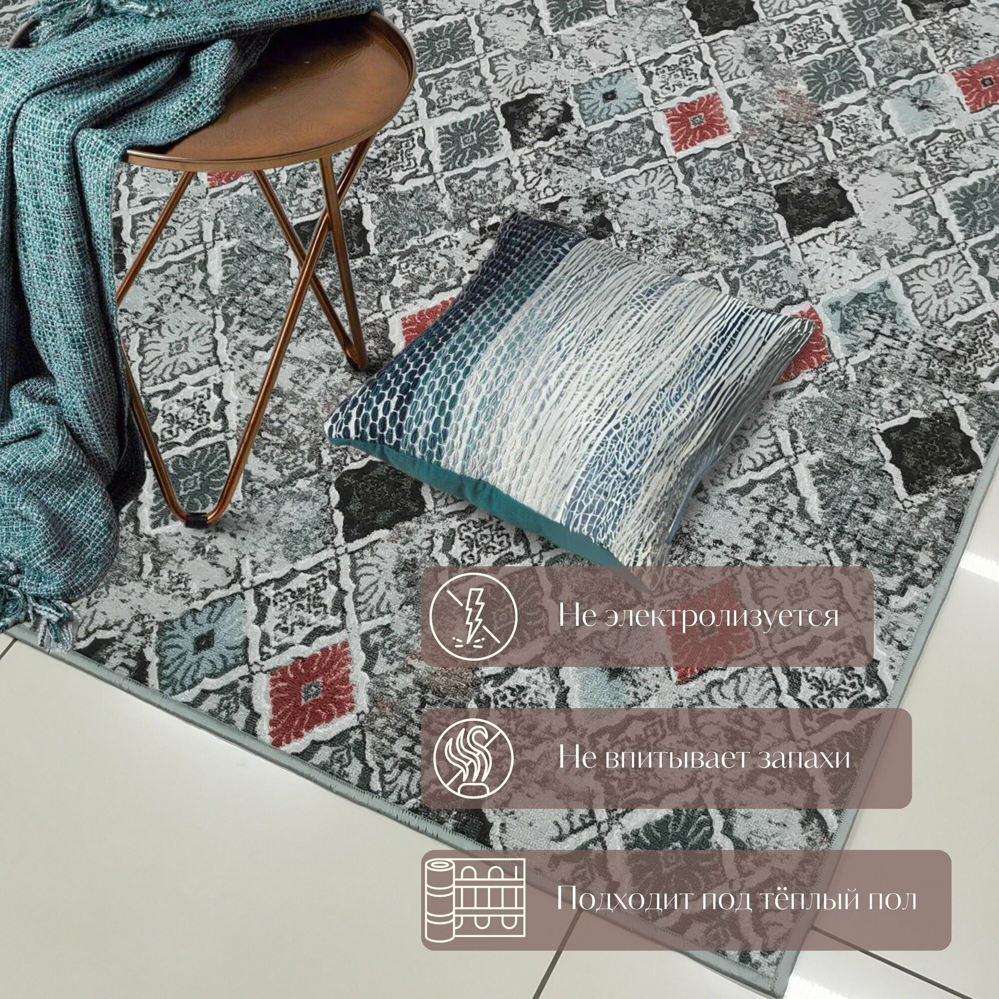 Безворсовый , противоскользящий коврик CarpetWorld "Мрамор" , полипропилен , микрофибра , прямоугольный , 100x60см.