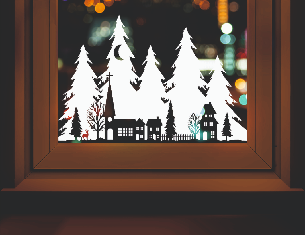 Купить Наклейка новогодняя для оформления окон и витрин "Дома на фоне леса" (50х34 см.). Декор для окон / новогодний.