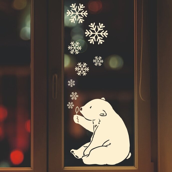 СохранитьНаклейка новогодняя для оформления окон и витрин "Мишка и снежинки" (40х47см.). Декор для окон / новогодний. интересное: