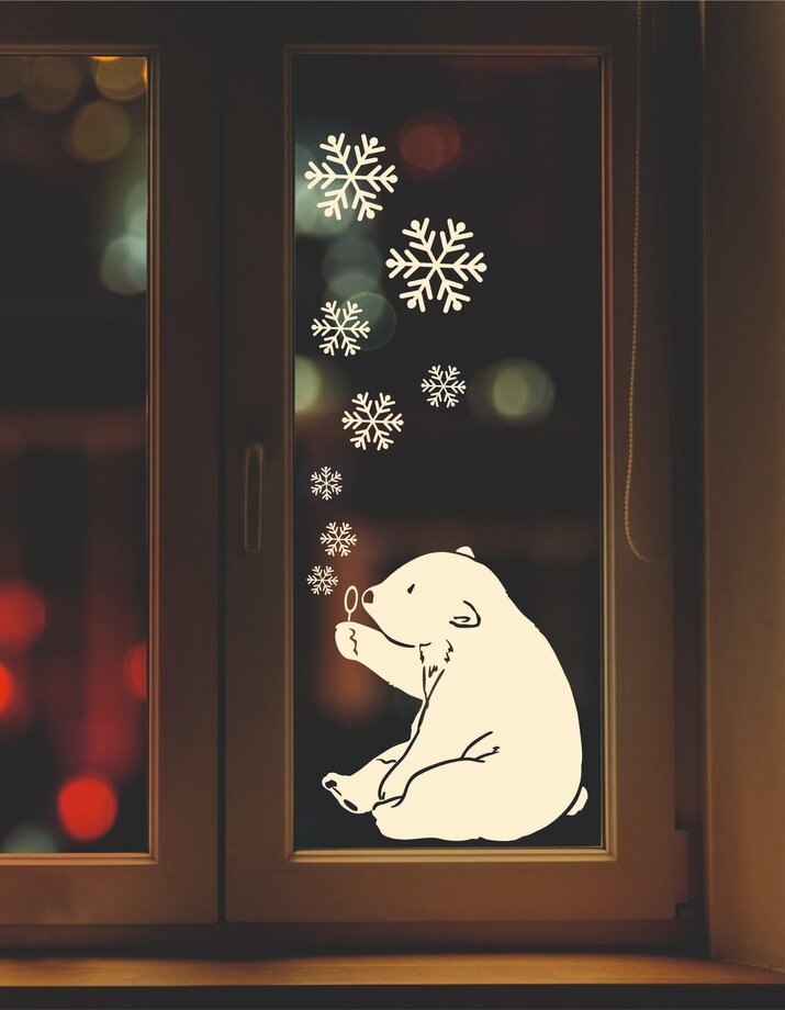 Купить Наклейка новогодняя для оформления окон и витрин "Мишка и снежинки" (40х47см.). Декор для окон / новогодний.
