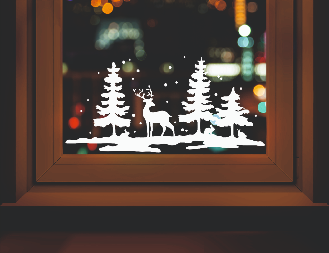 Купить Наклейка новогодняя для оформления окон и витрин "Олень в лесу" 50х24 см.). Декор для окон / новогодний.