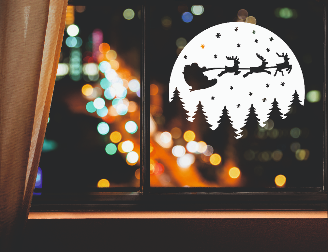 Купить Наклейка для оформления окон и витрин "Дед мороз и олени" (37х32 см.). Декор для окон / новогодний.