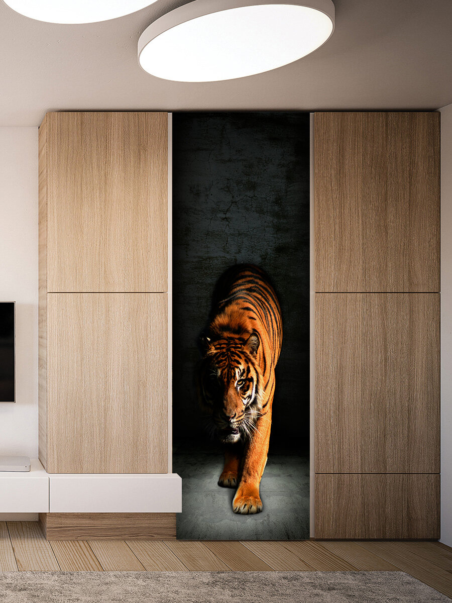 Купить Наклейка интерьерная на дверь "Дикий, притаившийся во тьме тигр", самоклеющаяся 80х200 см.