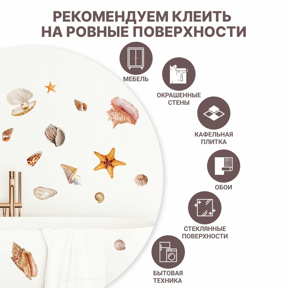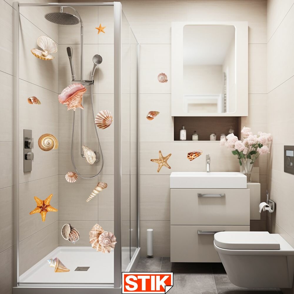 Наклейки интерьерные "Ракушки" Stik, для стен, мебели, кафеля. Самоклеящийся, водонепроницаемый декор для ванной комнаты интересное: