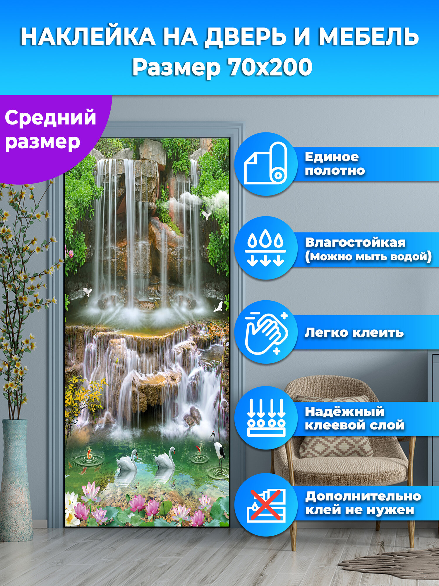 Наклейка интерьерная на дверь "Изумрудный водопад", самоклеющаяся 70х200 см. интересное: