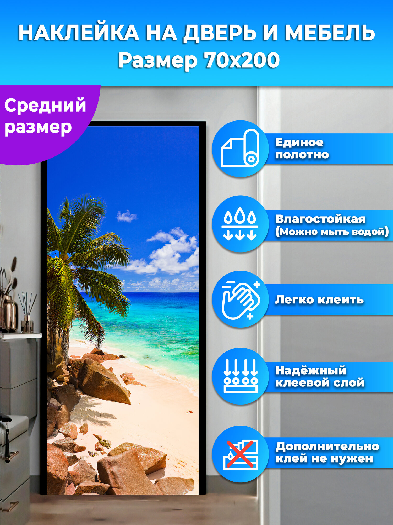 Наклейка интерьерная на дверь "Тропический пляж на Сейшельских островах", 70х200 см самоклеющаяся интересное: