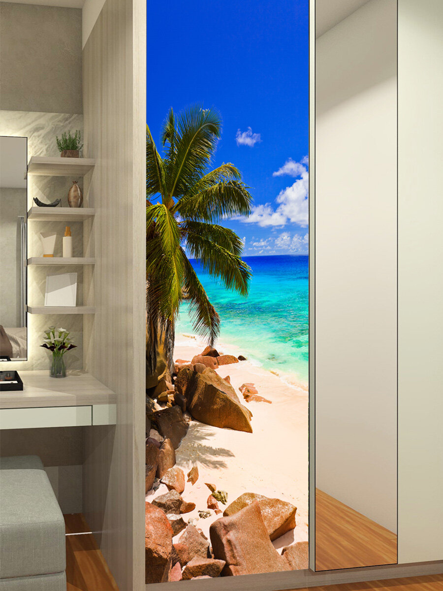 Наклейка интерьерная на дверь "Тропический пляж на Сейшельских островах", 60х200 см самоклеющаяся