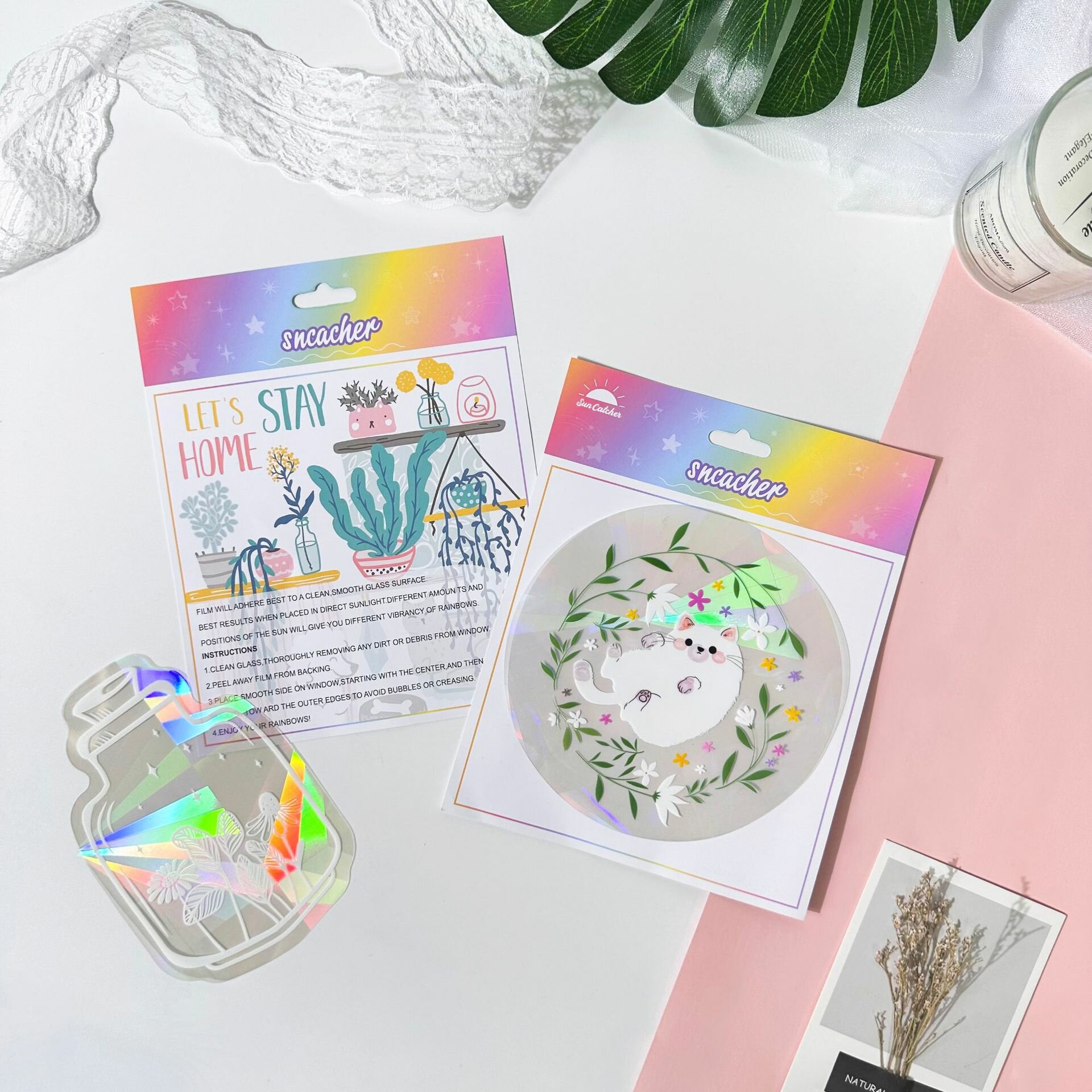 Наклейка лазерная на окно радуга / Призма радужная Rainbow / Ловец солнца (Белый кот)