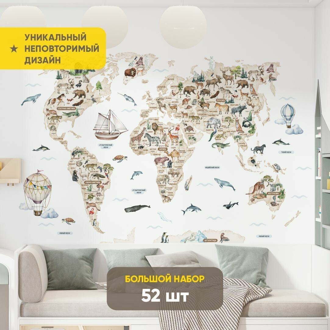 Карта мира с животными акварель стандарт, бежевая / Декор для детской комнаты - интерьерные наклейки на стену интересное: