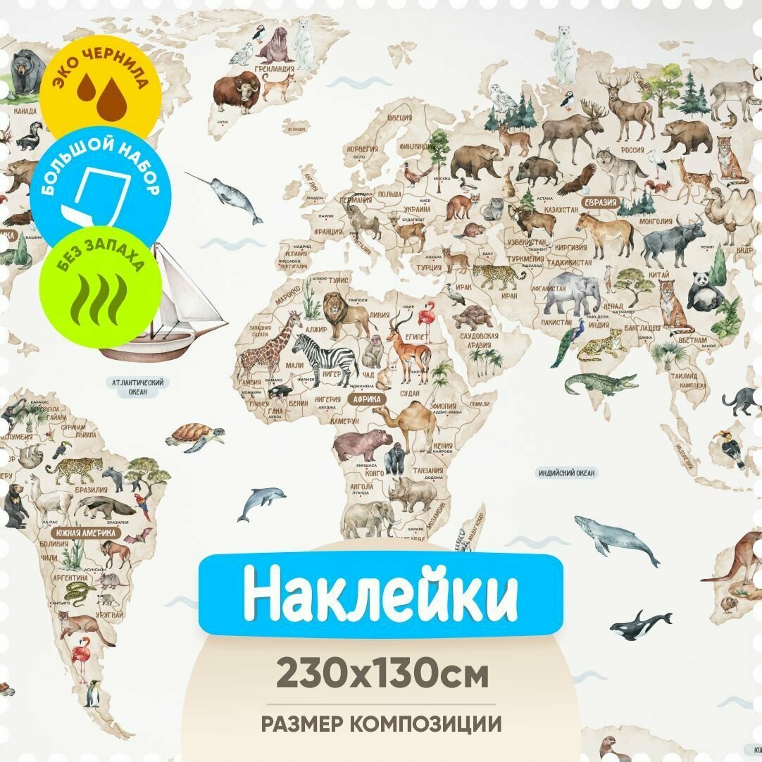 Ниже Вы можете прочитать отзывы на Карта мира с животными акварель стандарт, бежевая / Декор для детской комнаты - интерьерные наклейки на стену, ознакомится с подробными характеристиками, посмотреть интересные обзоры и фотографии на Карта мира с животными акварель стандарт, бежевая / Декор для детской комнаты - интерьерные наклейки на стену.
