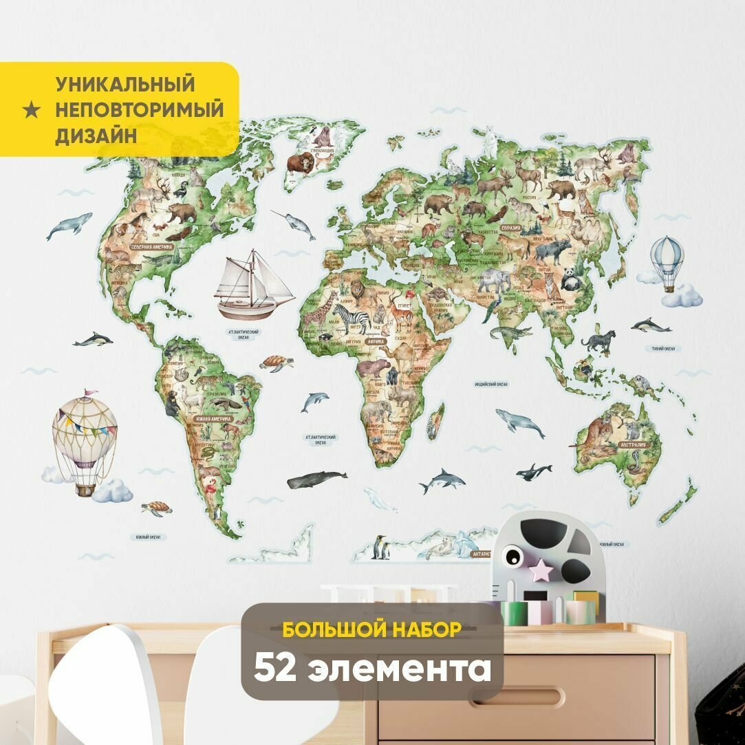 Карта мира с животными акварель, XS зеленая / Декор для детской комнаты - интерьерные наклейки на стену интересное: