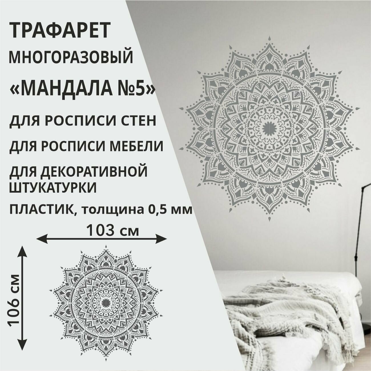 Трафарет "Мандала №6" 60х60 см - для творчества и декора стен, мебели, плитки и штукатурки. Многоразовый, пластик 0,5 мм