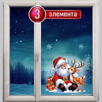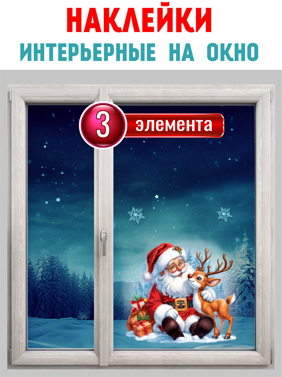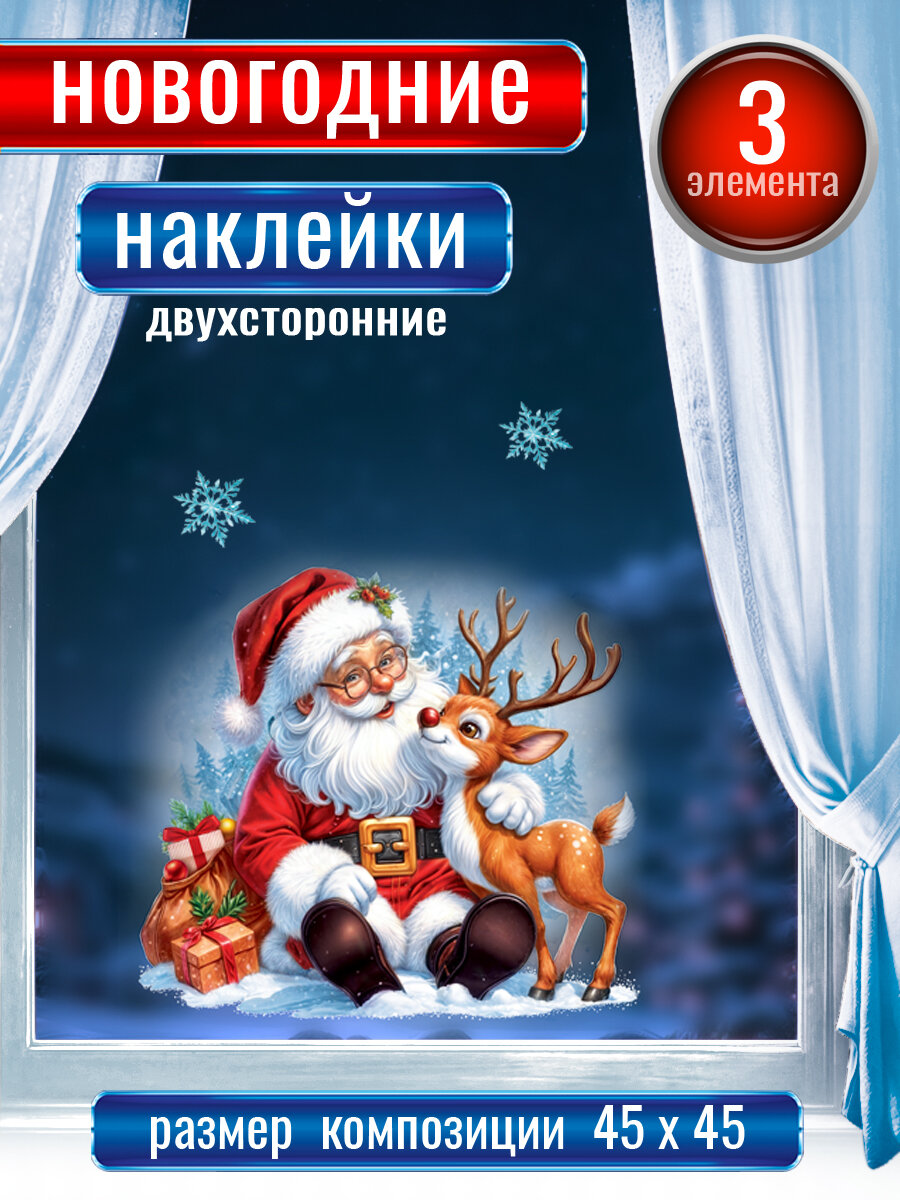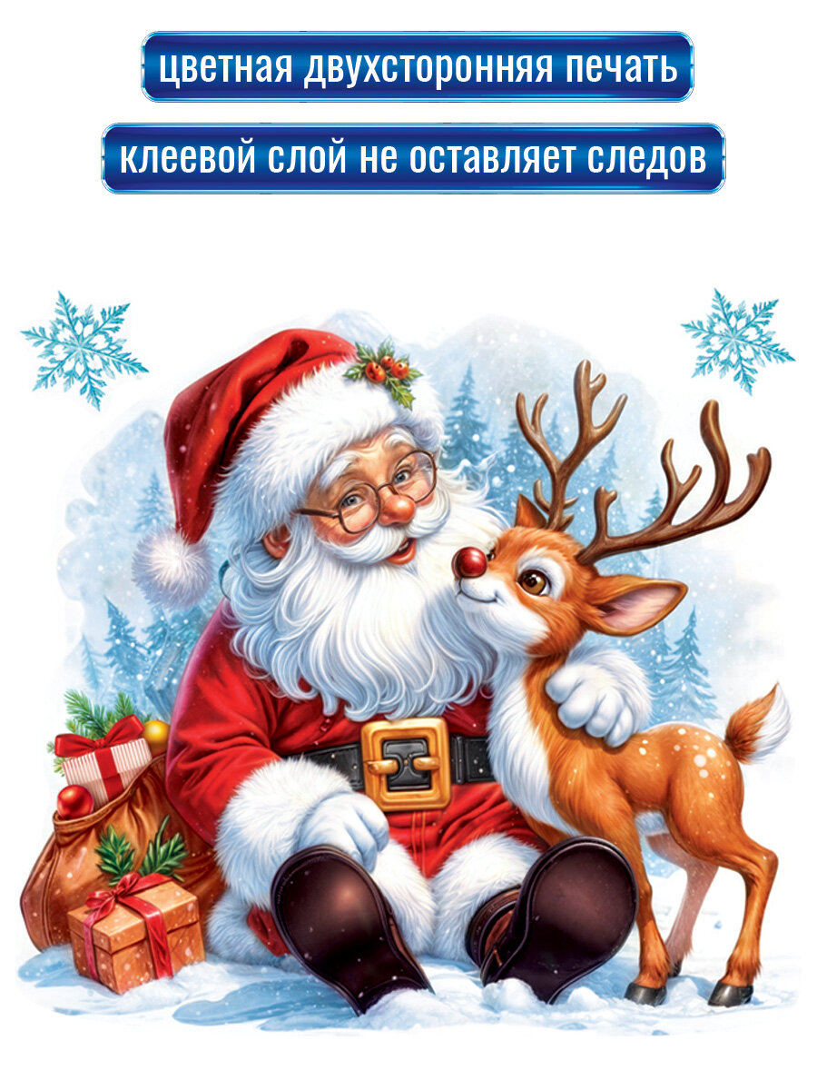 Новогодние наклейки с двухсторонней цветной печатью на окна "Дед Мороз с оленем" интересное: