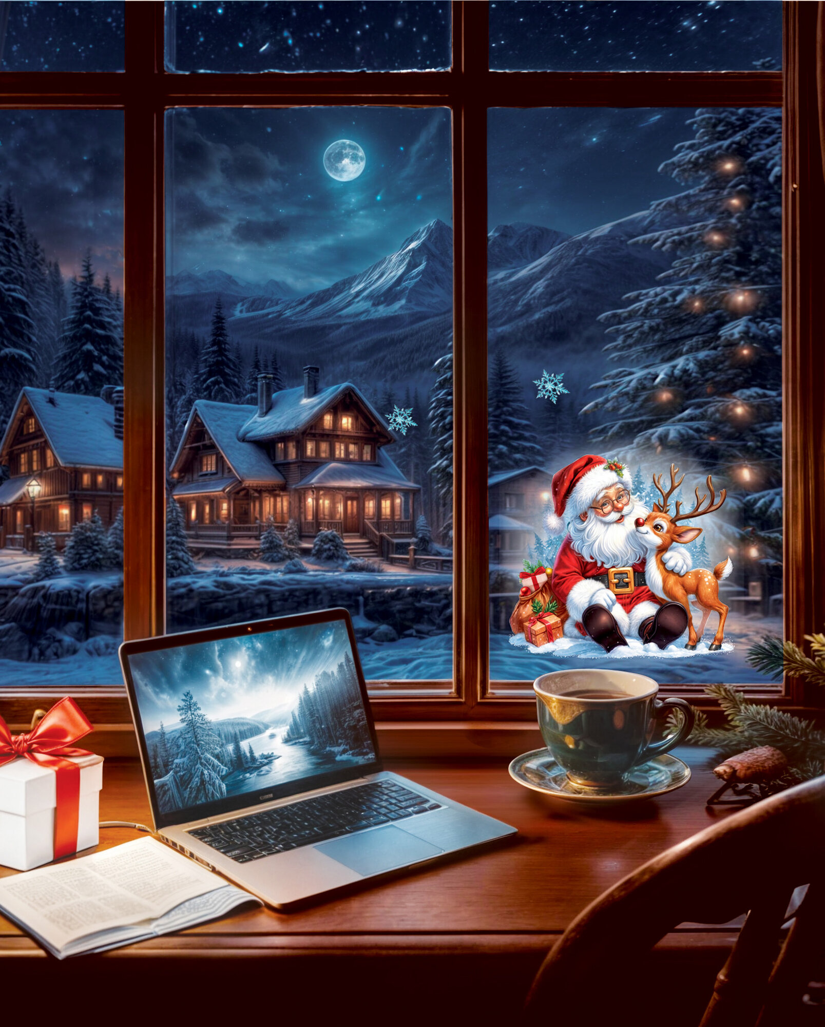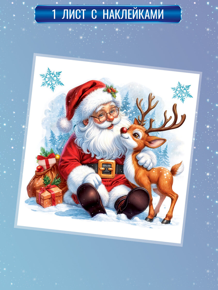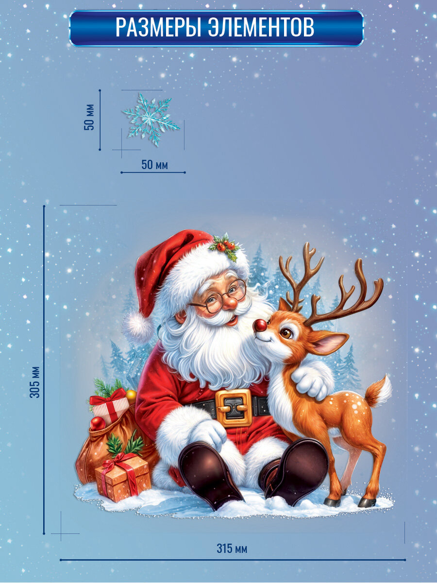 Новогодние наклейки с двухсторонней цветной печатью на окна "Дед Мороз с оленем" интересное: