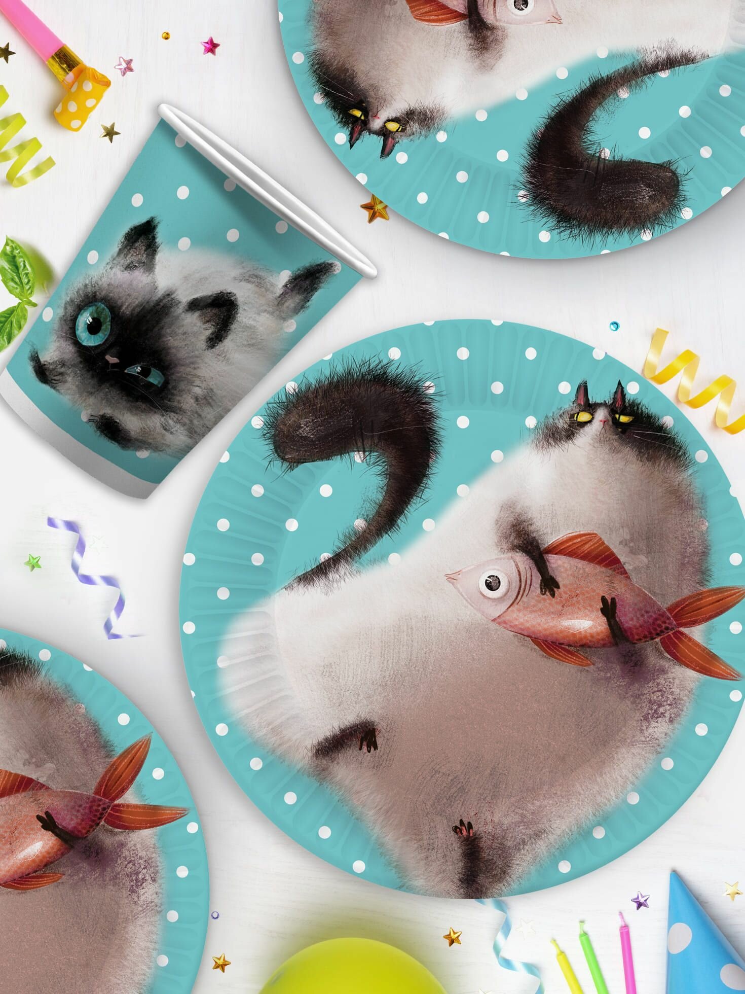 Купить Набор одноразовой бумажной посуды для праздника ND Play / Кот и рыбка (стакан, тарелка 23 см, по 12 шт.)