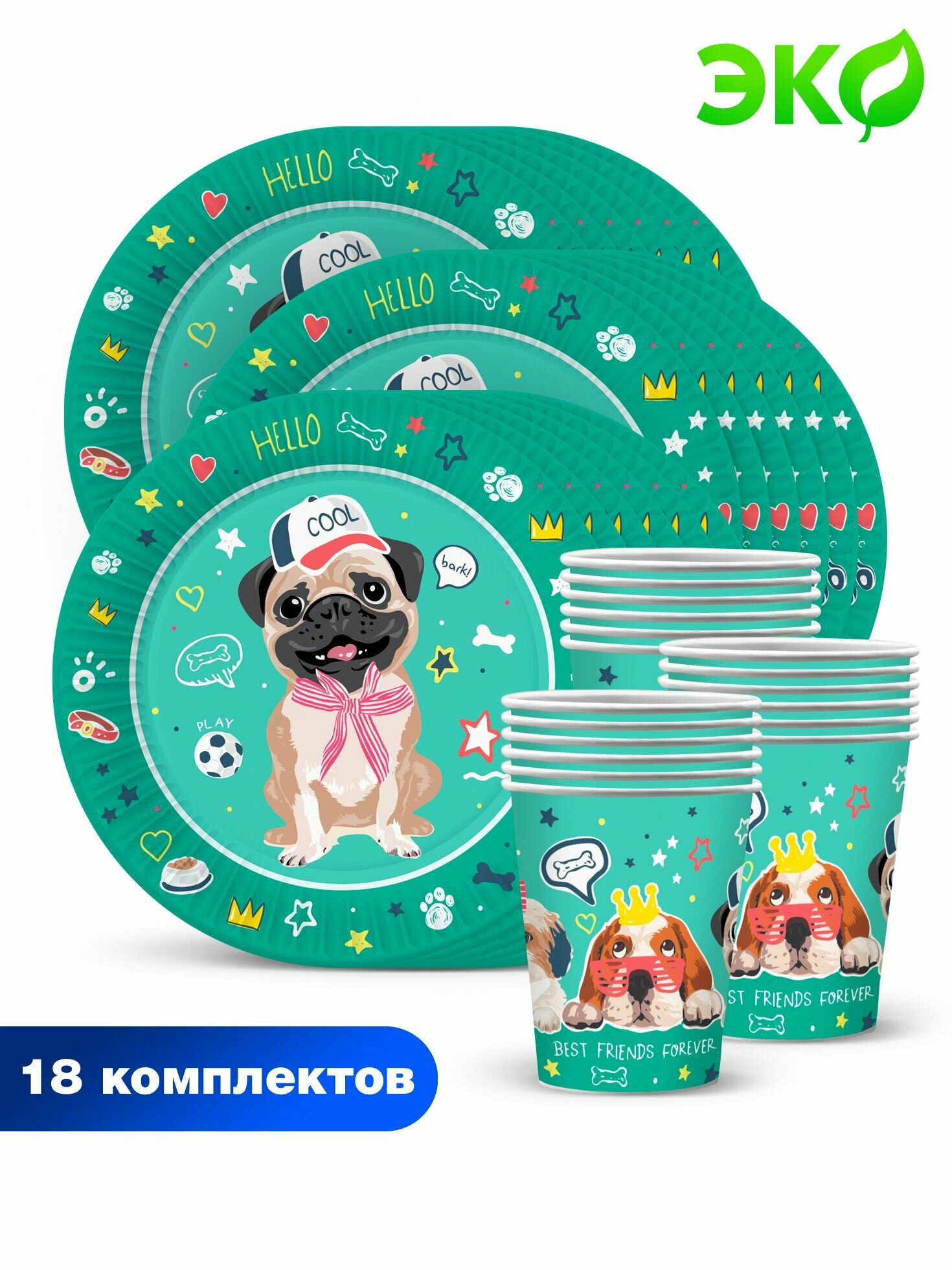 Купить Набор одноразовой бумажной посуды для праздника ND Play / Собачки на зеленом (тарелка 23 см, стакан, по 18 шт.)