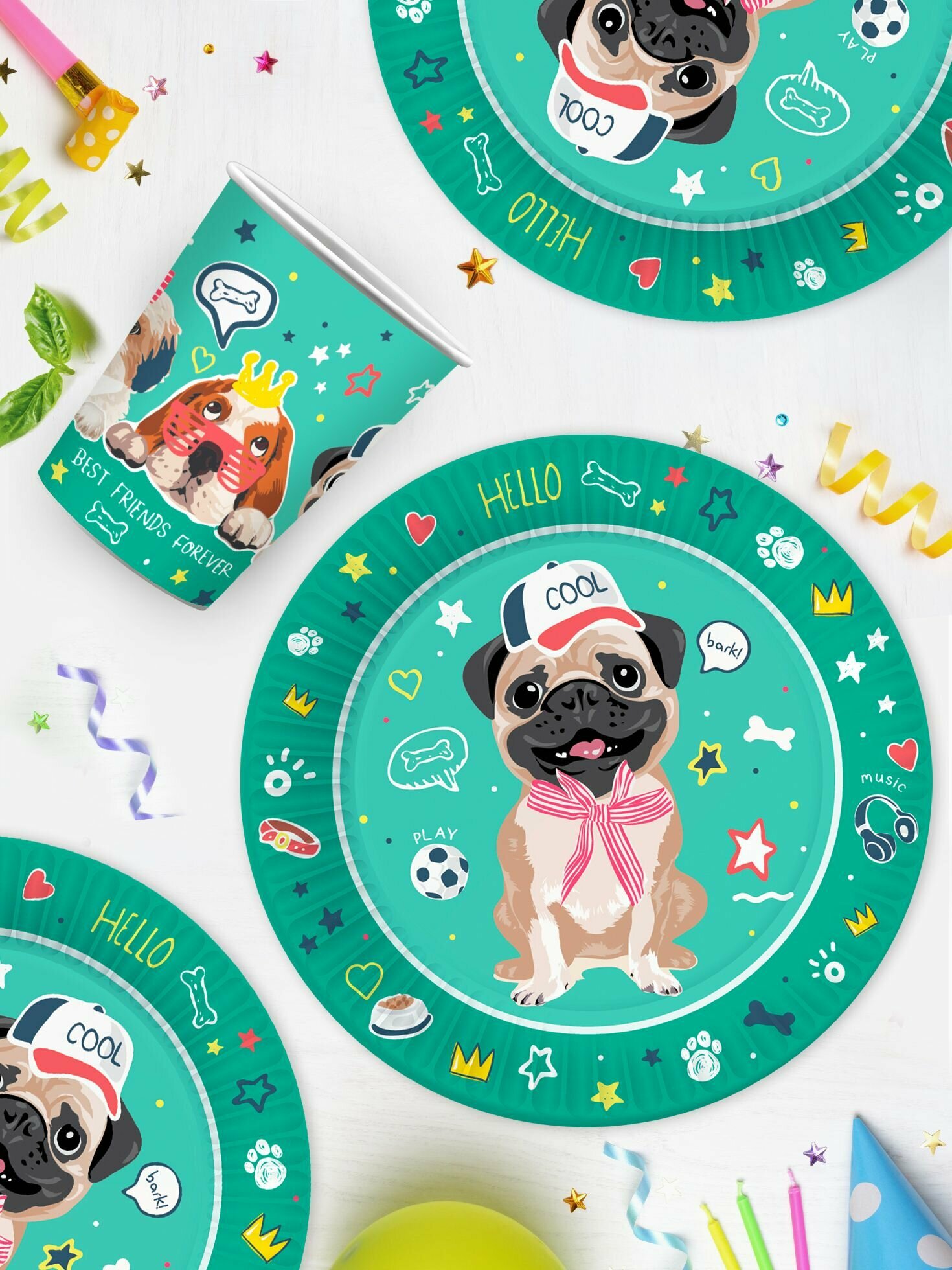 Купить Набор одноразовой бумажной посуды для праздника ND Play / Собачки на зеленом (тарелка 23 см, стакан, по 12 шт.)