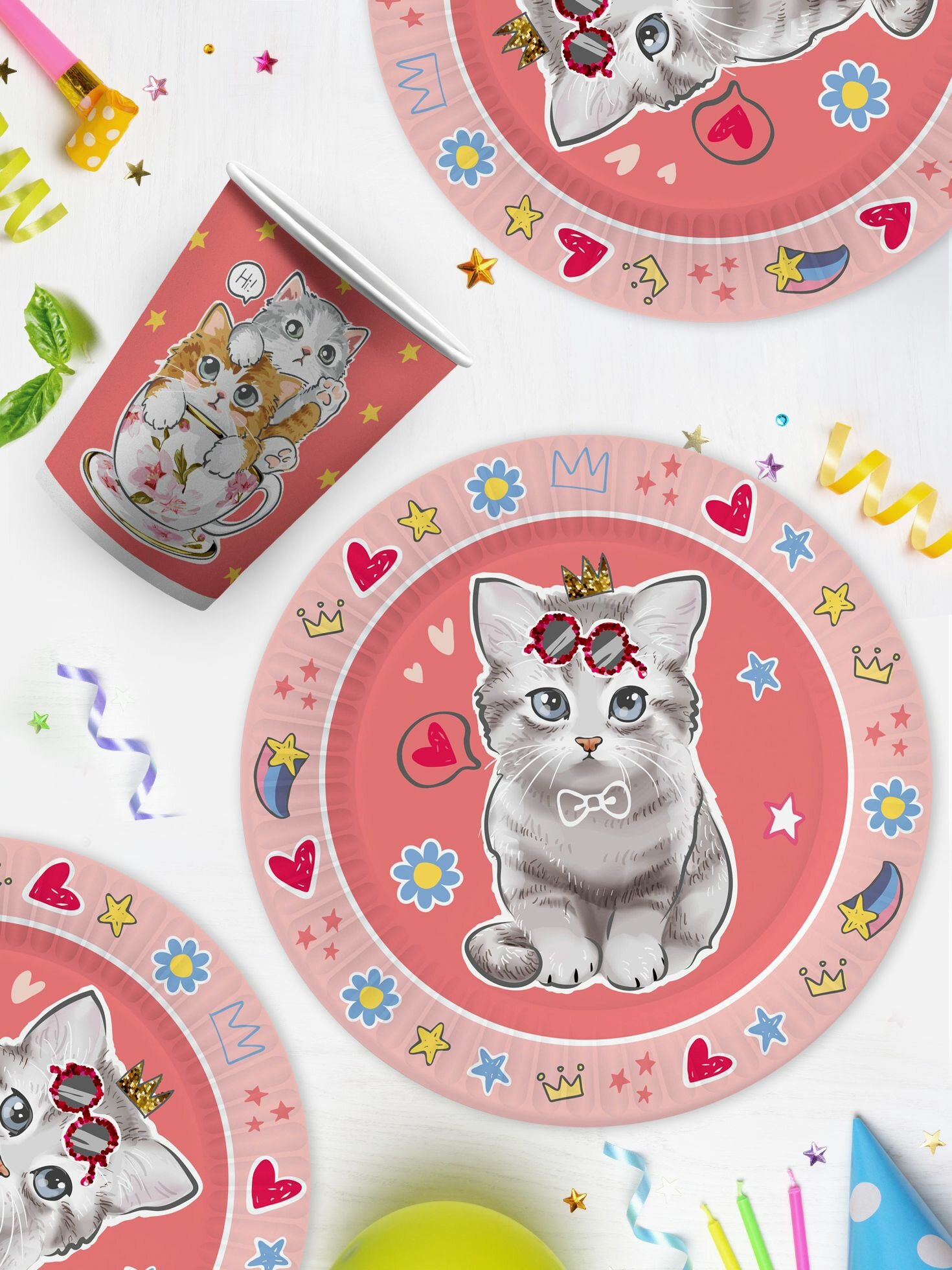 Набор одноразовой бумажной посуды для праздника ND Play / Котики на персиковом (тарелка 23 см, стакан, по 12 шт.)