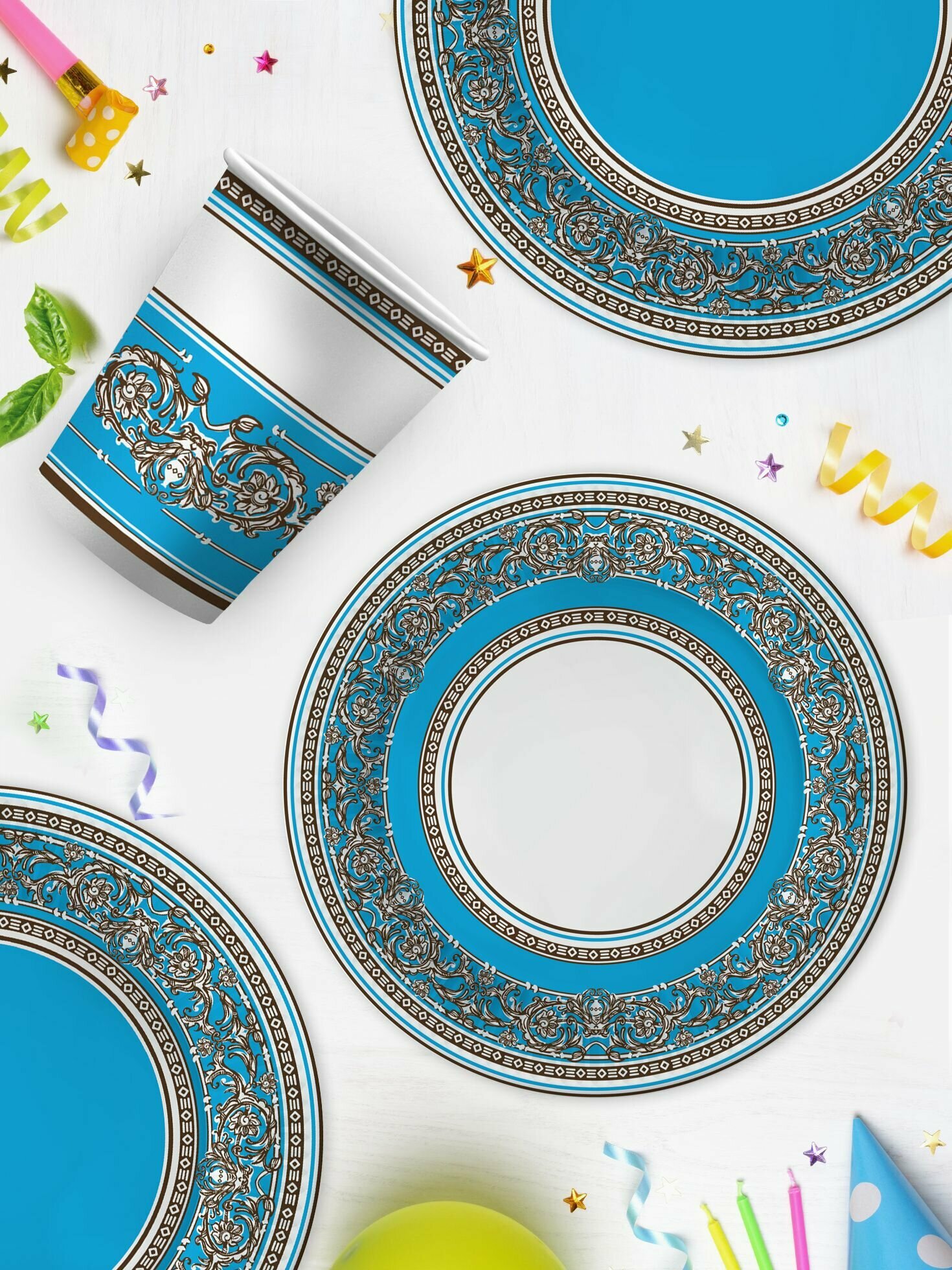 Набор бумажной одноразовой посуды для праздника ND Play / Смола синяя (тарелка 23 см, стакан, по 12 шт.)
