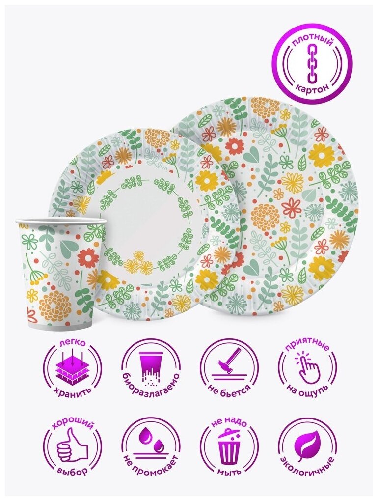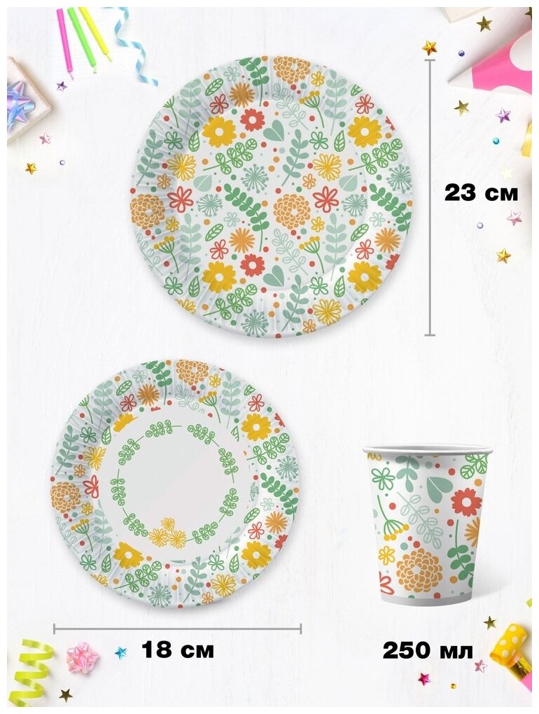Набор бумажной одноразовой посуды для праздника Цветы. Дизайн 2 (тарелка мал, тарелка бол, стакан, по 18 шт.) ND Play