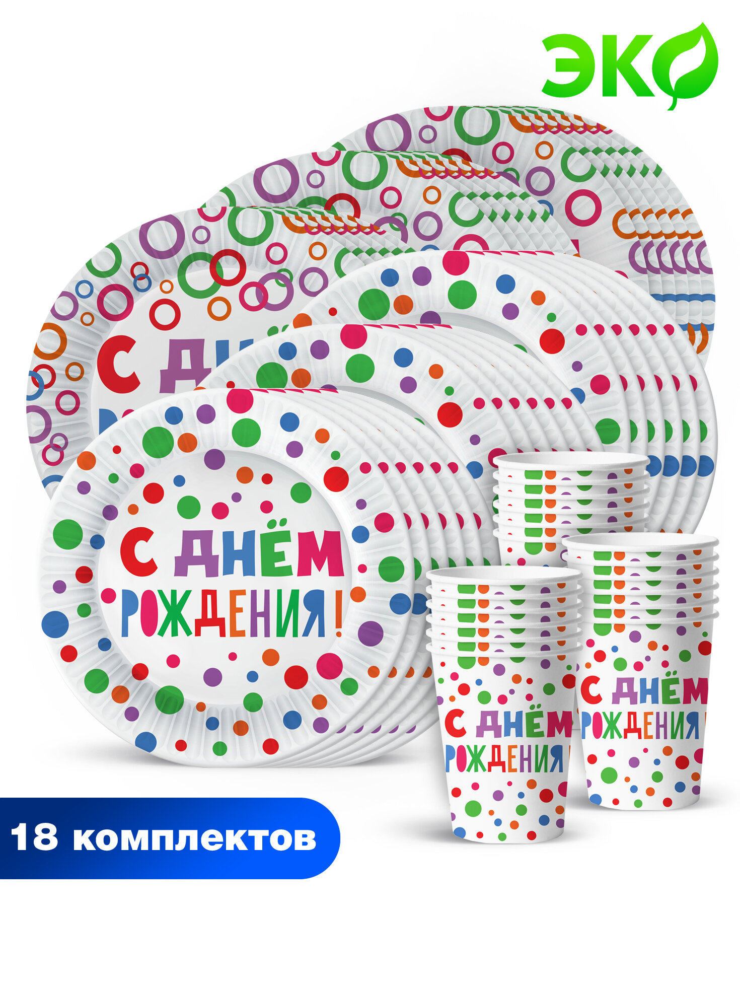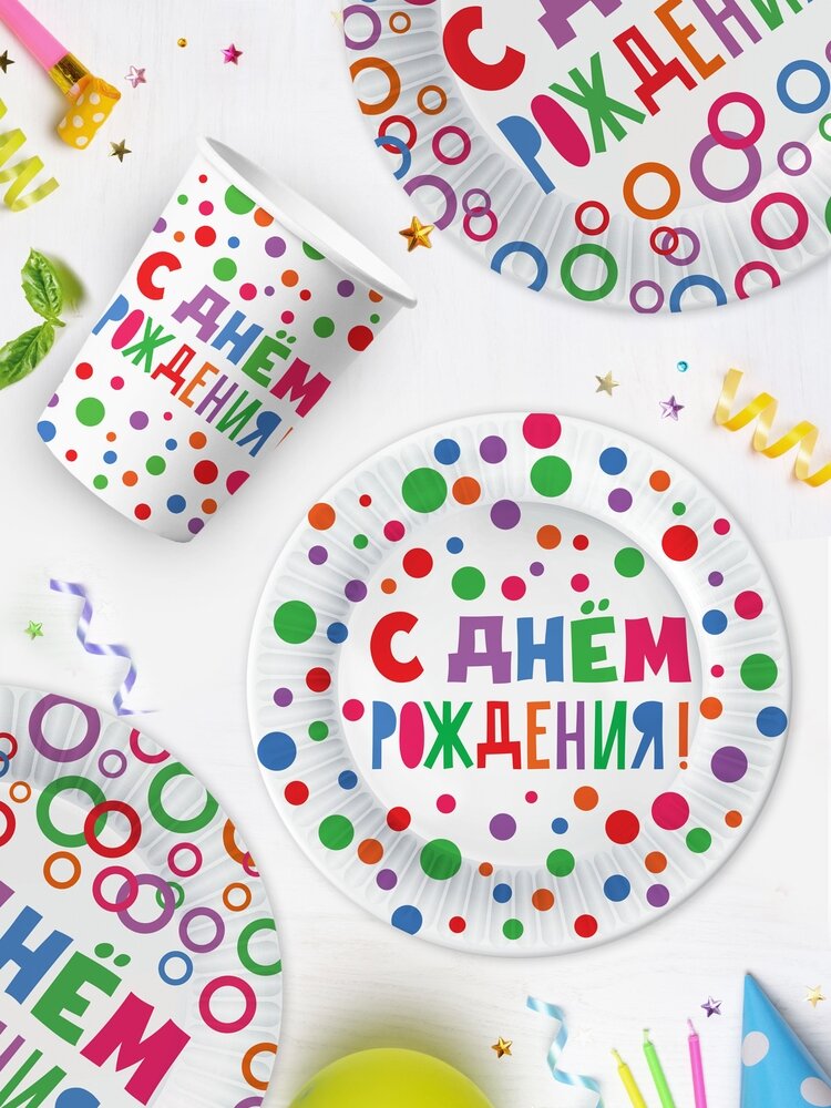 Купить Набор для праздника С Днем Рождения! (тарелка бол, тарелка мал, стакан, по 18 шт.)