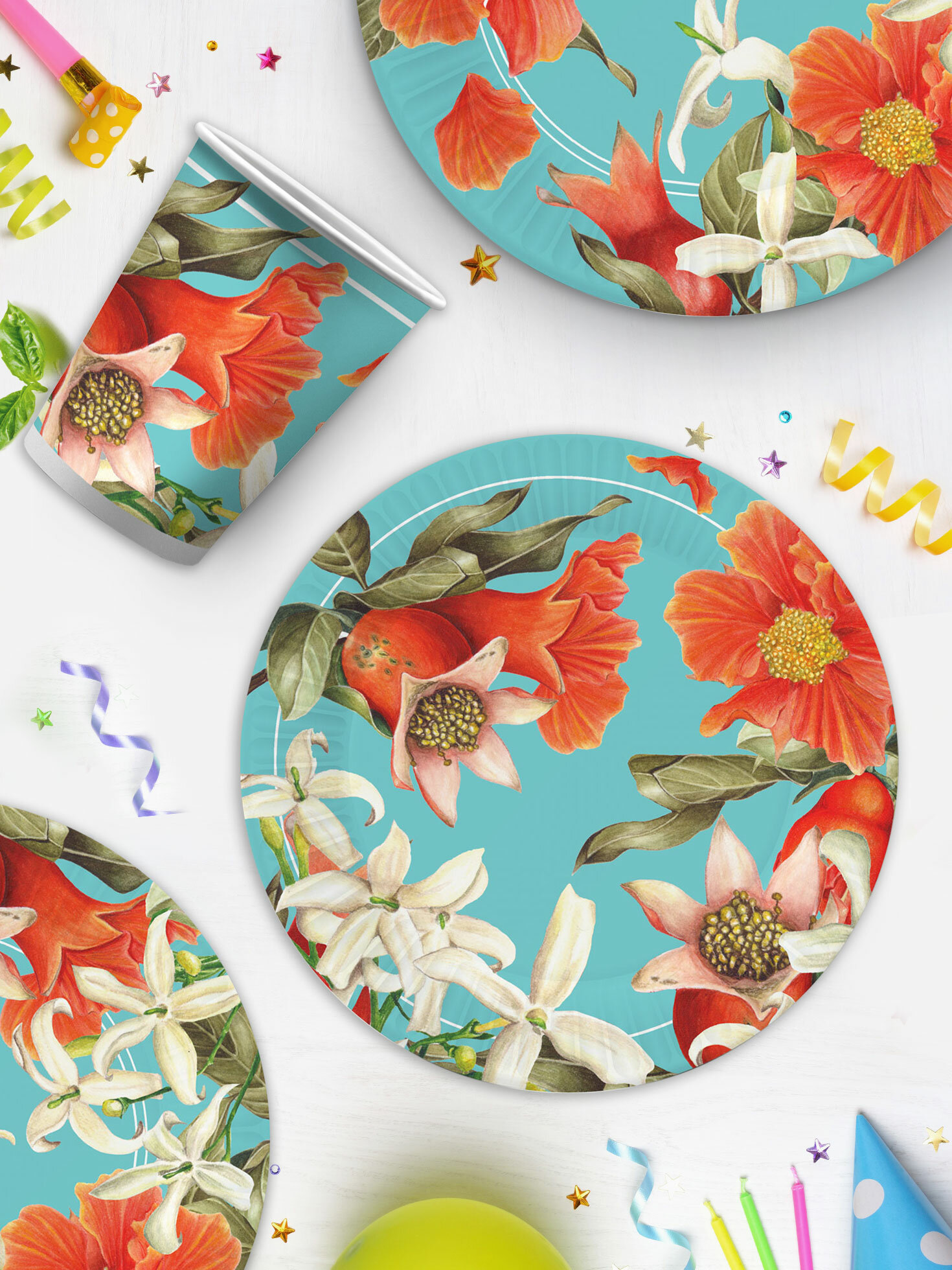 Купить Набор бумажной одноразовой посуды для праздника Гранат на бирюзовом (тарелка мал, тарелка бол, стакан, по 12 шт.) ND Play