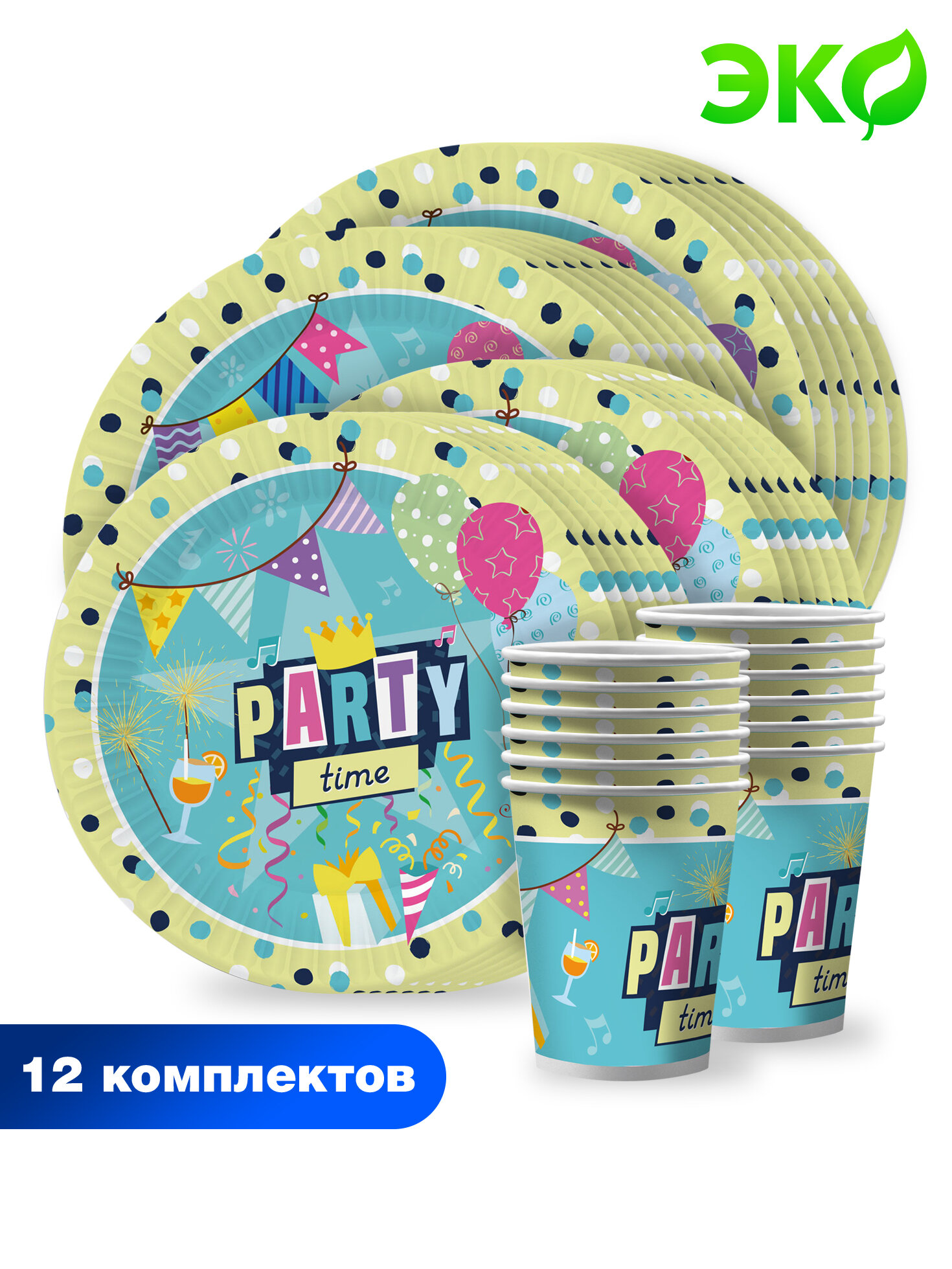 Набор бумажной одноразовой посуды для праздника Эко-стиль (тарелка мал, тарелка бол, стакан, по 12 шт.) ND Play