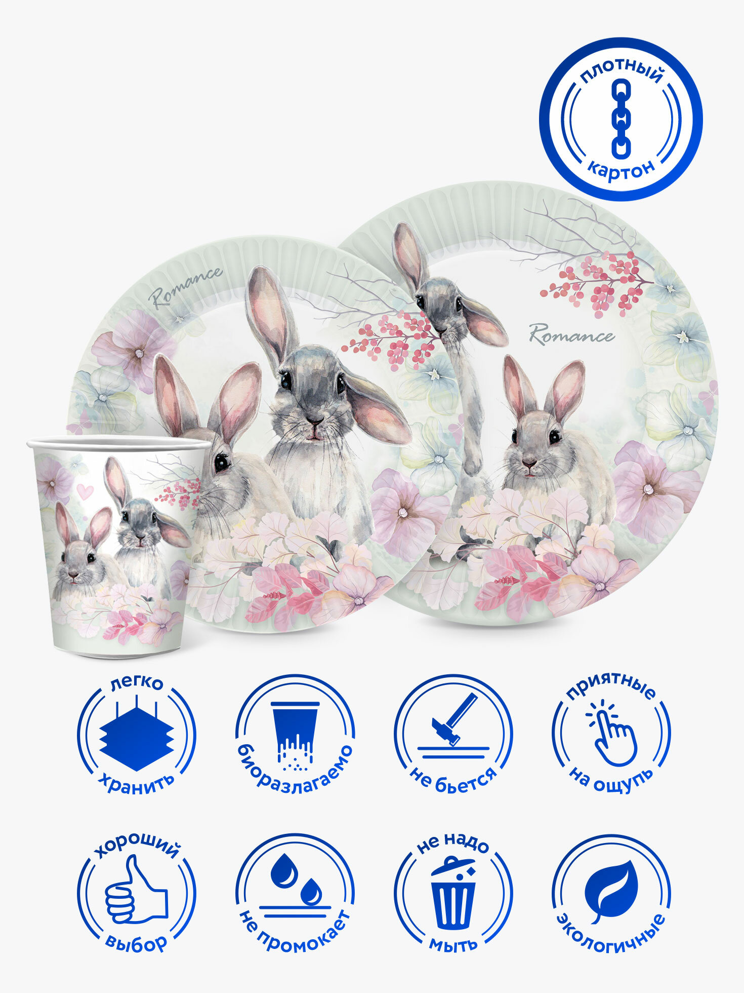 Набор одноразовой бумажной посуды для праздника ND Play / Милые кролики (тарелка 18 см, тарелка 23 см, стакан 250 мл по 12 шт.), 306858