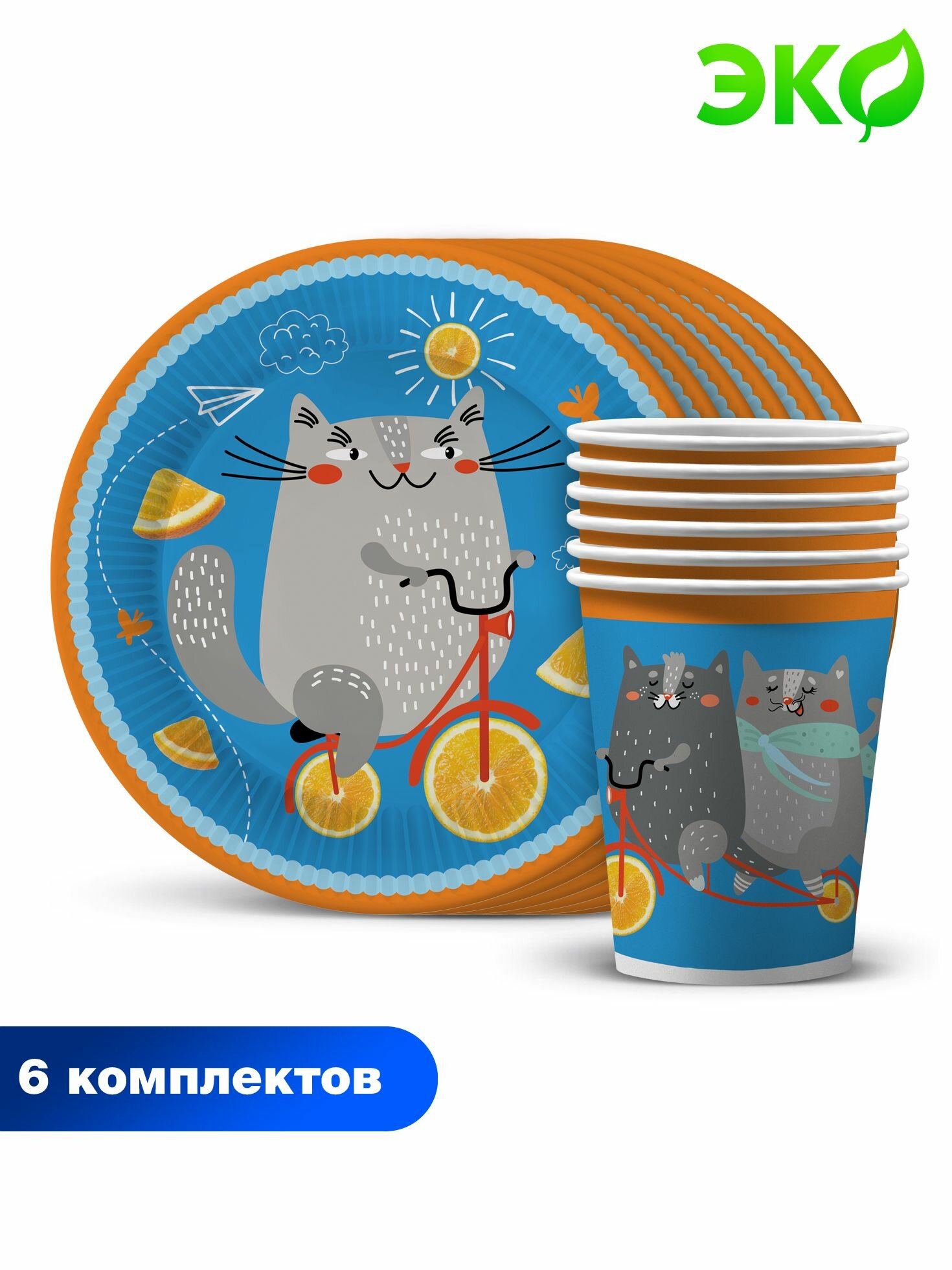 Купить Набор одноразовой бумажной посуды для праздника ND Play / Кот на вело-апельсине (тарелка 18 см, стакан, по 6 шт.)