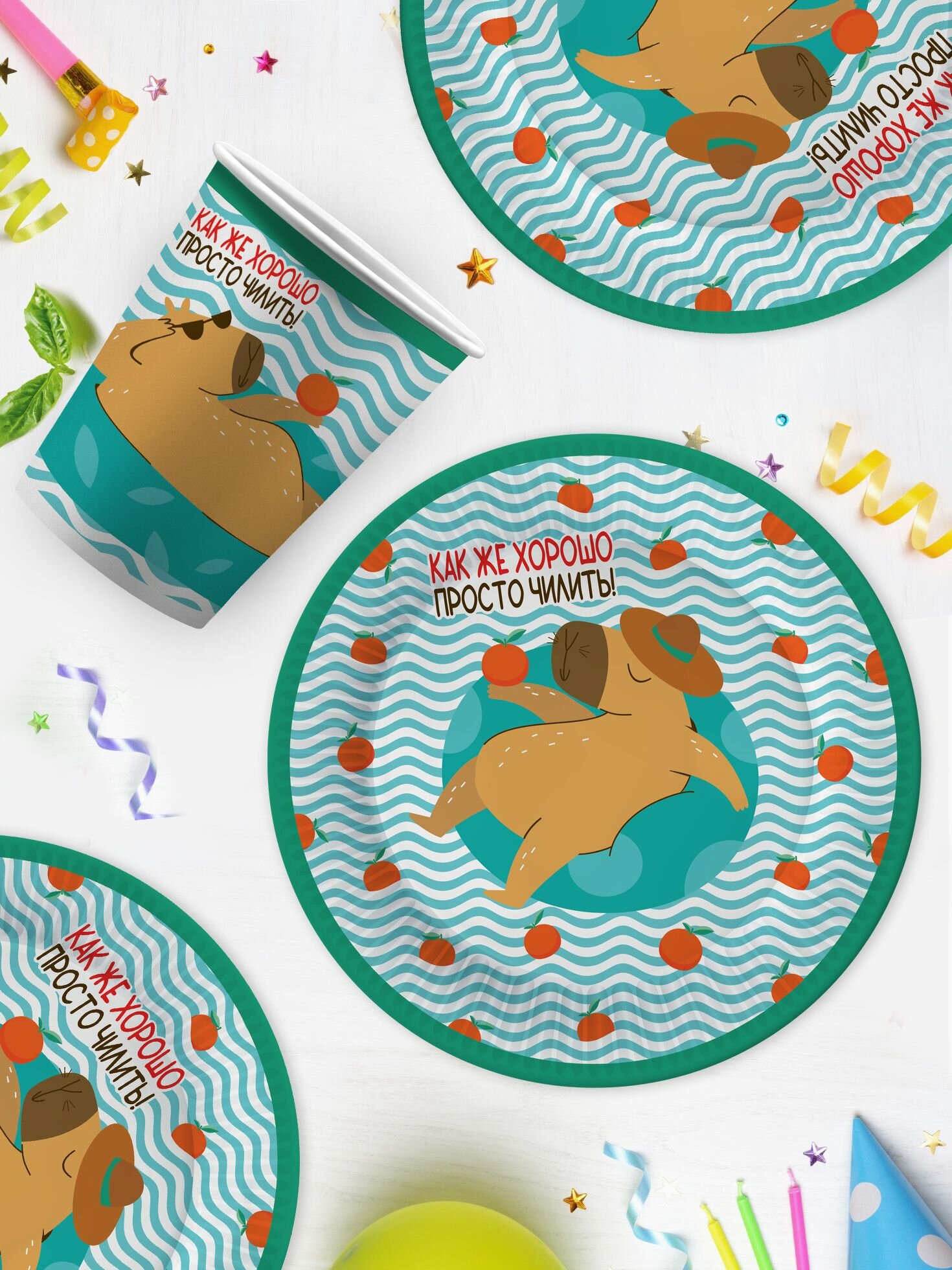 Купить Набор одноразовой бумажной посуды для праздника ND Play / Капибара на чиле (тарелка 18 см, стакан, по 6 шт.)